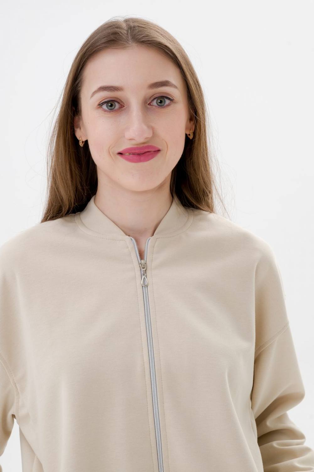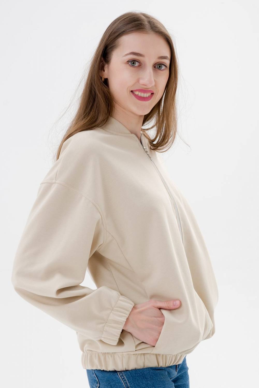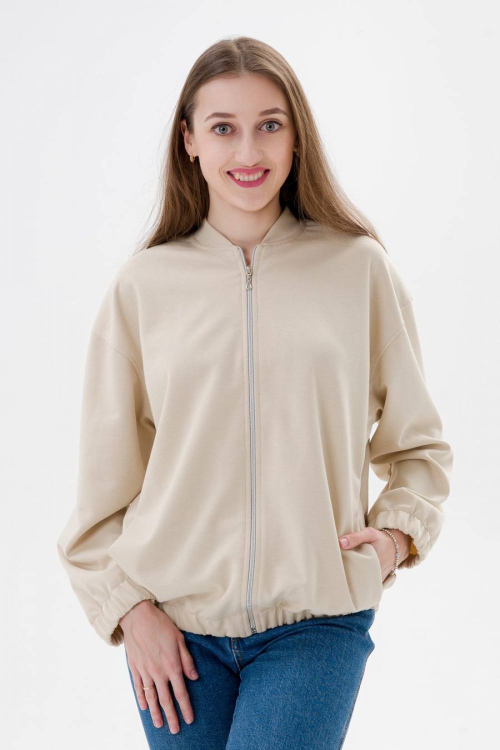 Толстовка женская на молнии, бомбер, выполнена из трикотажного полотна, изготовленного из хлопка и полиэстера в равных частях. Прямой силуэт, свободный крой, спущенное плечо. Рукава втачные на цельнокроеных манжетах с резинкой внутри. Ворот круглый с притачной бейкой из основного материала. Полочка с рельефными швами по бокам. В рельефах обработаны внутренние карманы. Низ изделия на цельнокроеном поясе с резинкой внутри.
