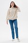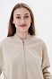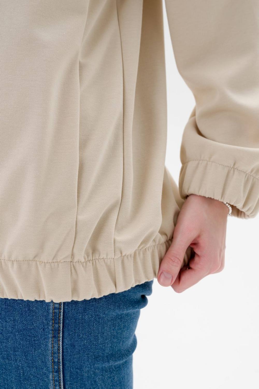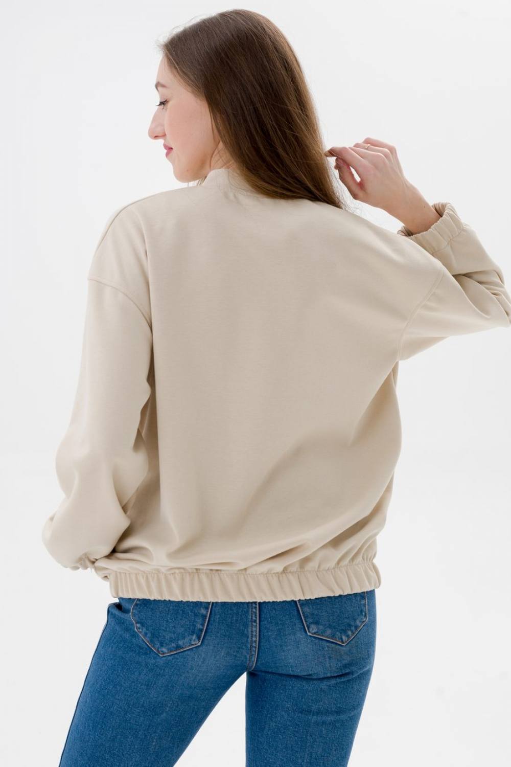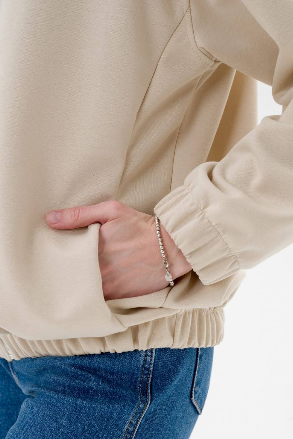 Толстовка женская на молнии, бомбер, выполнена из трикотажного полотна, изготовленного из хлопка и полиэстера в равных частях. Прямой силуэт, свободный крой, спущенное плечо. Рукава втачные на цельнокроеных манжетах с резинкой внутри. Ворот круглый с притачной бейкой из основного материала. Полочка с рельефными швами по бокам. В рельефах обработаны внутренние карманы. Низ изделия на цельнокроеном поясе с резинкой внутри.