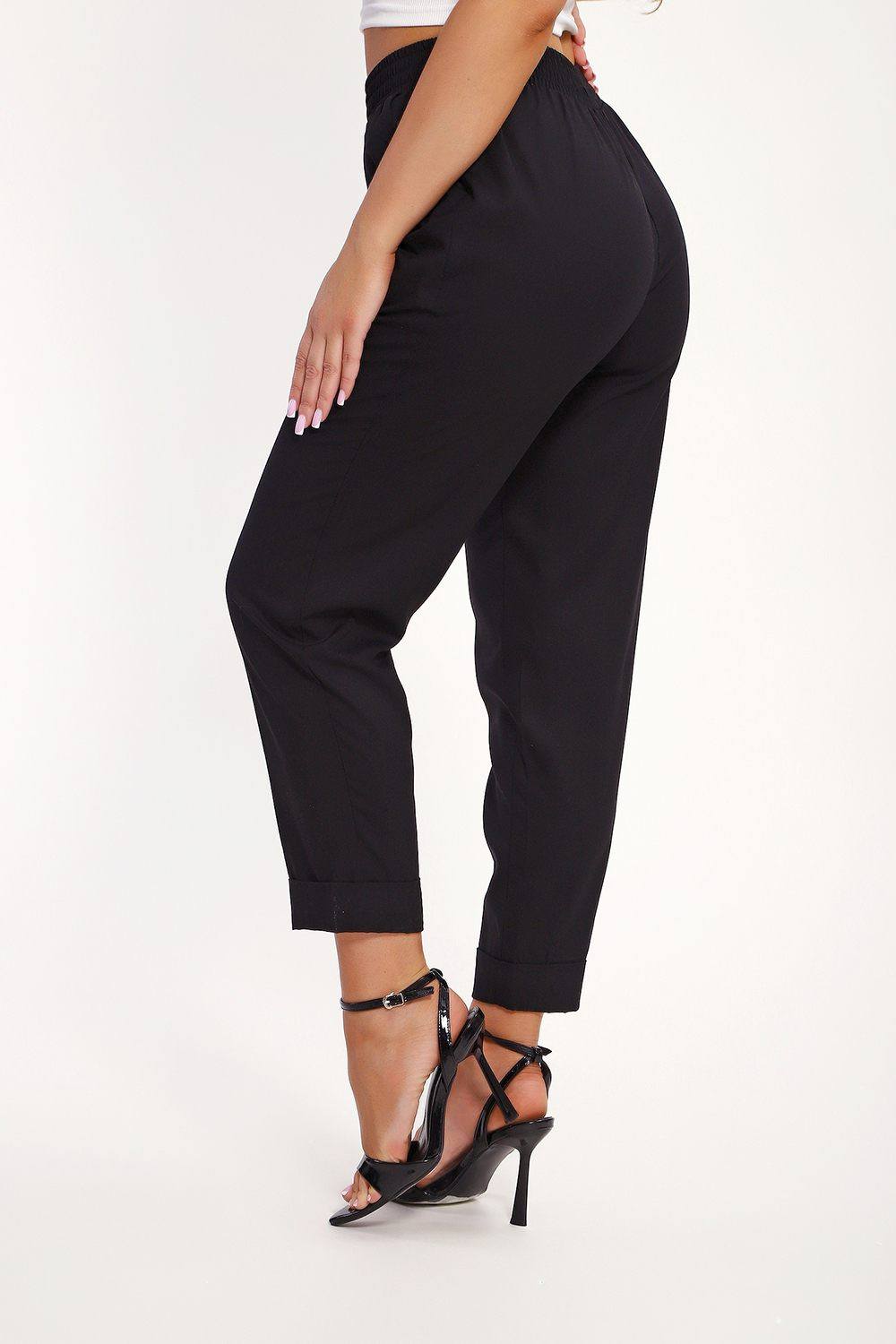 Брюки имеют два боковых внутренних кармана. Длина их 7/8, снизу притачаны манжеты, которые можно подвернуть наверх или отвернуть вниз, чтобы удлинить штаны. В замерах указана длина брюк с подвернутыми наверх манжетами. Рост модели 167см. Обхват талии в замерах соответствует длине резинки в растянутом виде.