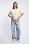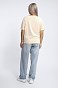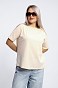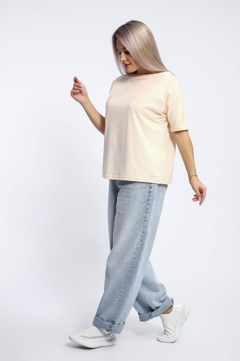 Футболка женская выполнена из мягкой хлопковой ткани. Модель с цельнокроеными короткими рукавами, горловина "лодочка" обработана однотонным кантом. Цвет ткани нежно-персиковый, фото плохо передает.