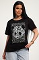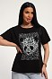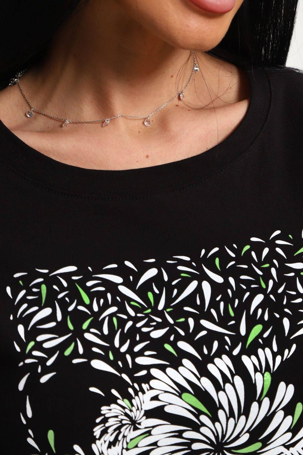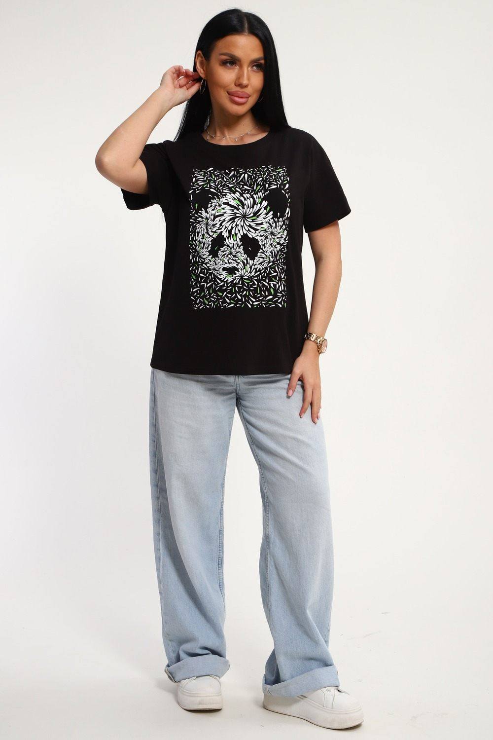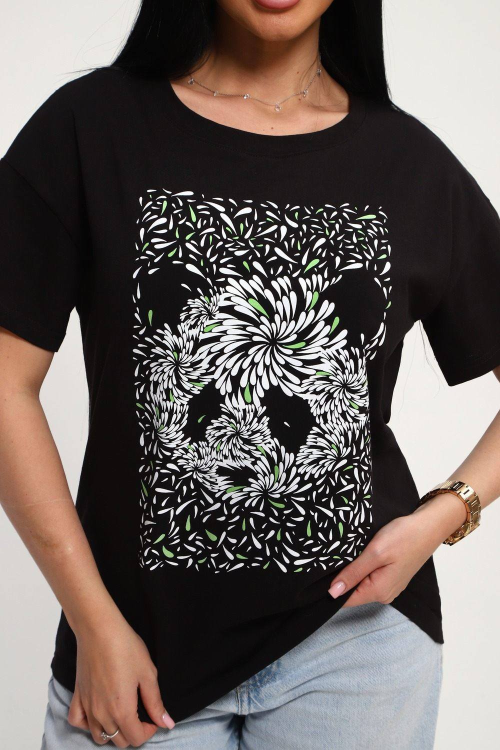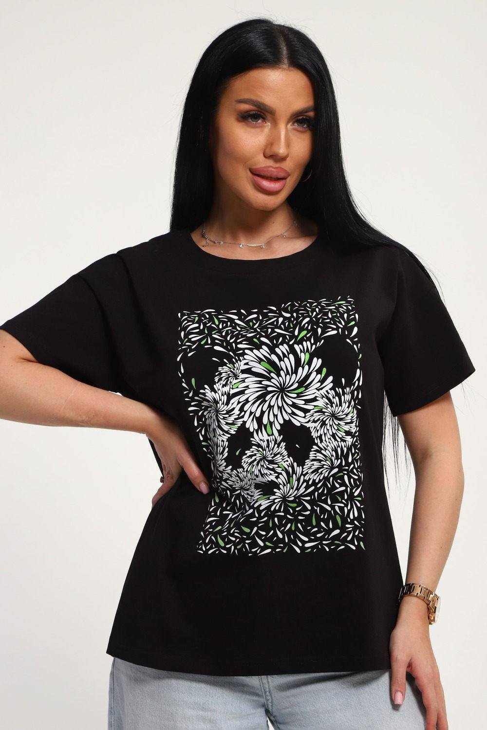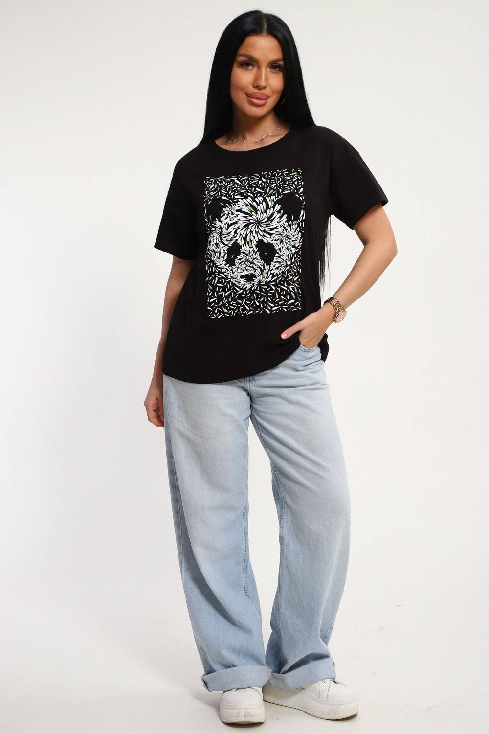 Футболка женская из гладкокрашенного трикотажа, хлопок 100%. Прямого силуэта, свободного облегания. горловина круглой формы. Рукав короткий. Низ изделия прямой. На полочке принт, шелкография.