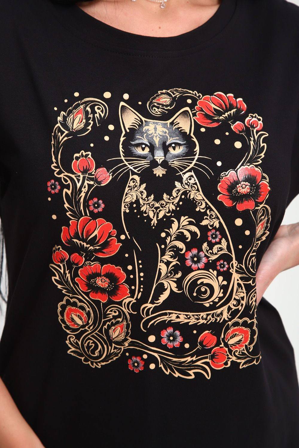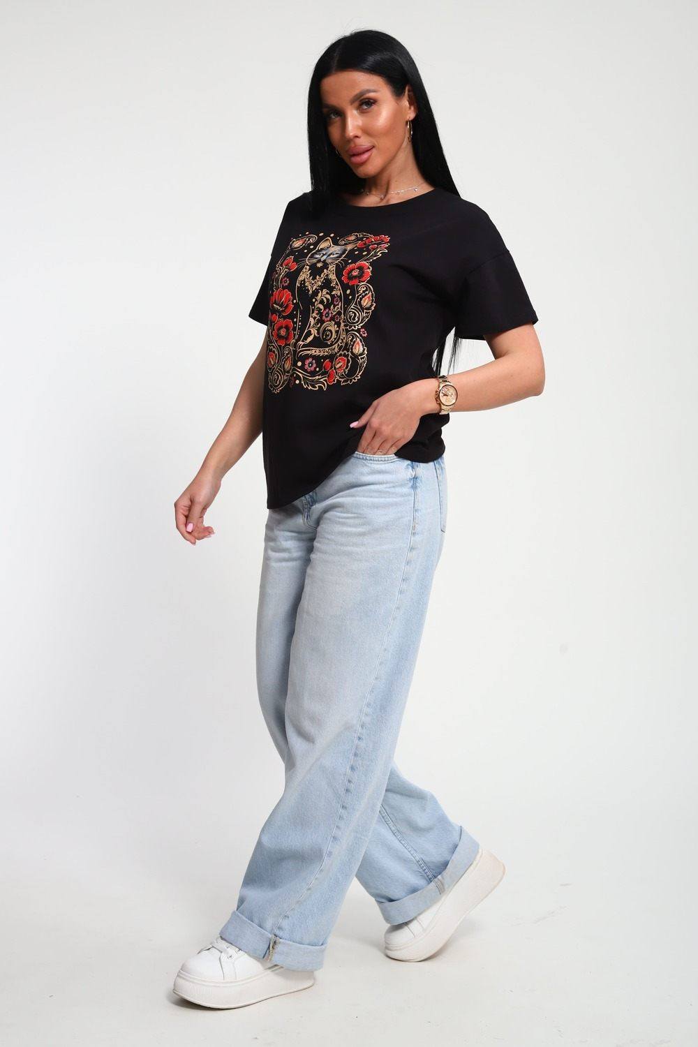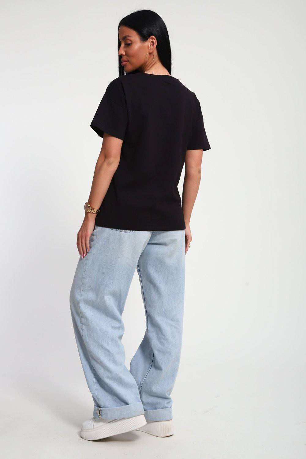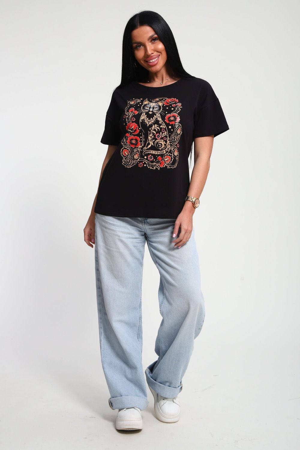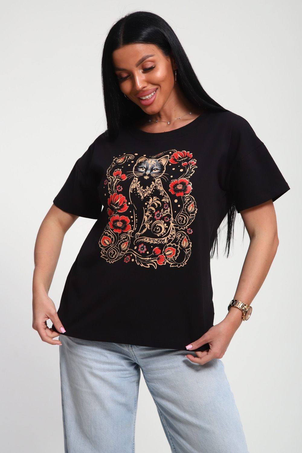 Футболка женская из гладкокрашенного трикотажа, хлопок 100%. Прямого силуэта, свободного облегания. горловина круглой формы. Рукав короткий. Низ изделия прямой. На полочке принт, шелкография.