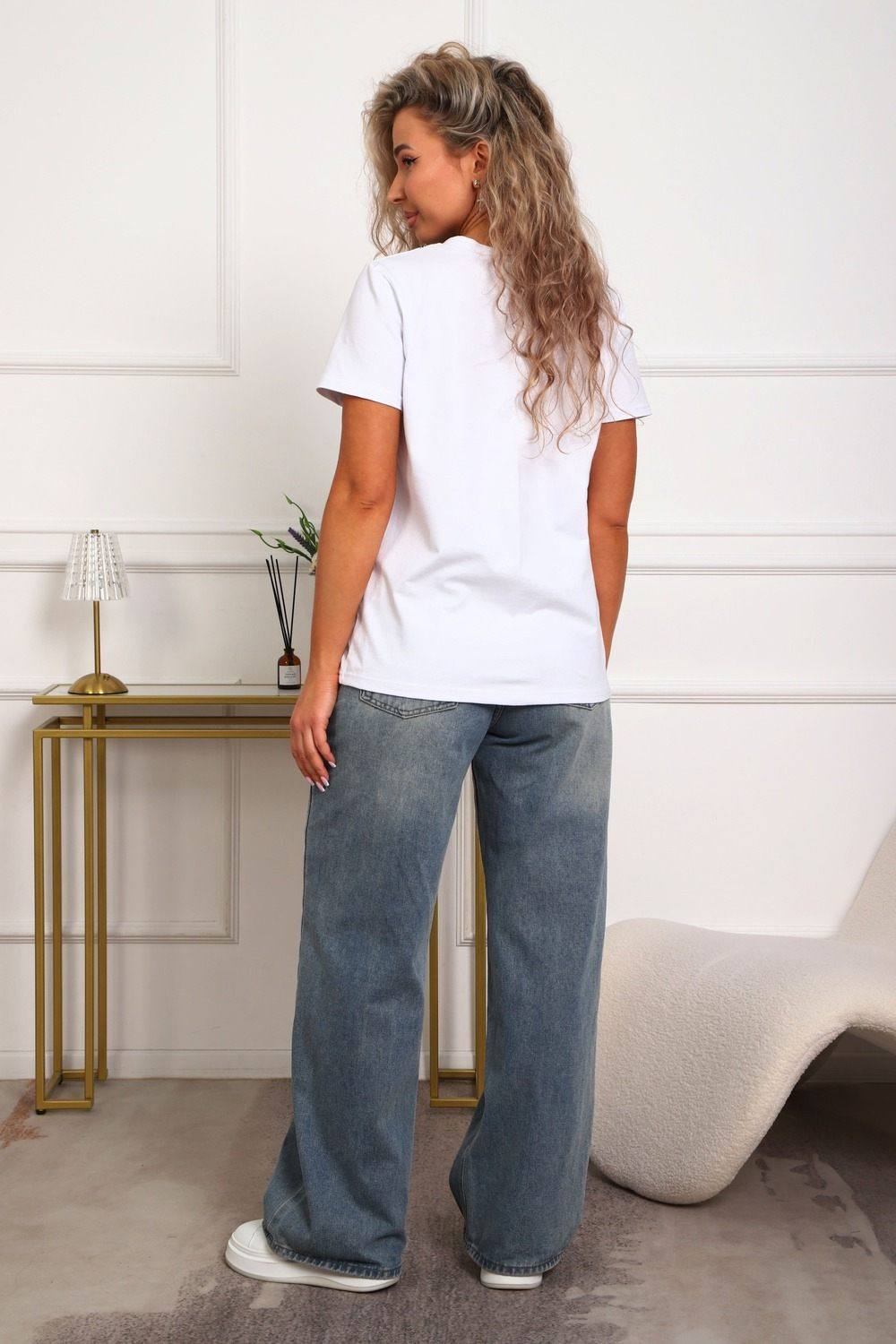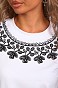 Футболка женская прямого силуэта. Низ изделия прямой. Длинна до середины бедра, плечо на естественном месте, рукав короткий. Горловина круглой формы, обработана планкой . Принт (шелкография пуф) в виде кружевного воротника.