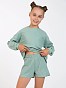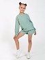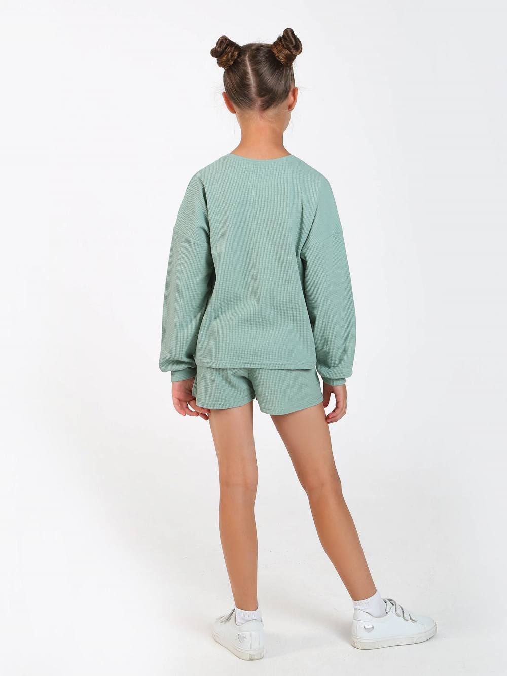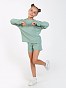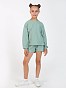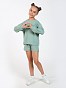 Костюм из мягкого вафельного хлопчатобумажного трикотажа актуального приглушенного оливкового цвета. Свитшот свободного кроя, круглый вырез горловины, длинные рукава со спущенной проймой на манжетах. Свободные шорты с имитацией гульфика. Пояс притачной на широкой резинке внутри, простроченной вместе с поясом.