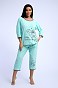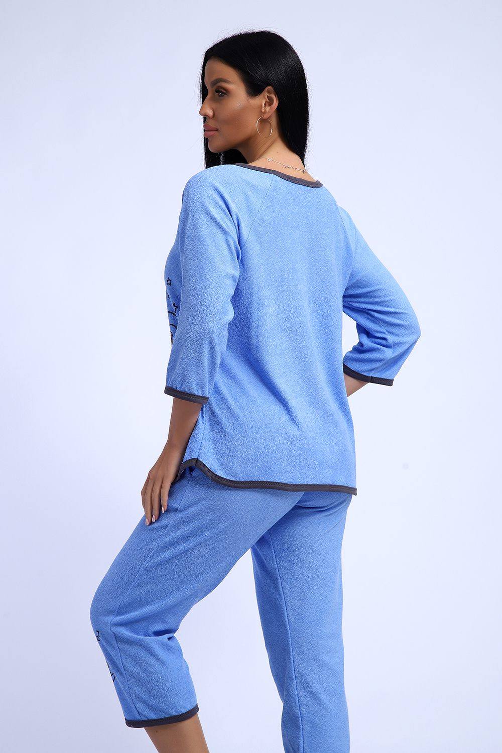Симпатичный махровый костюм из футболки и бриджей. Футболка с рукавом-реглан длиной 3/4, на полочке изображение совы на фоне луны и звезд. Бриджи свободные, на резинке, с боковыми кармашками, на одной половинке - изображение маленькой совы.