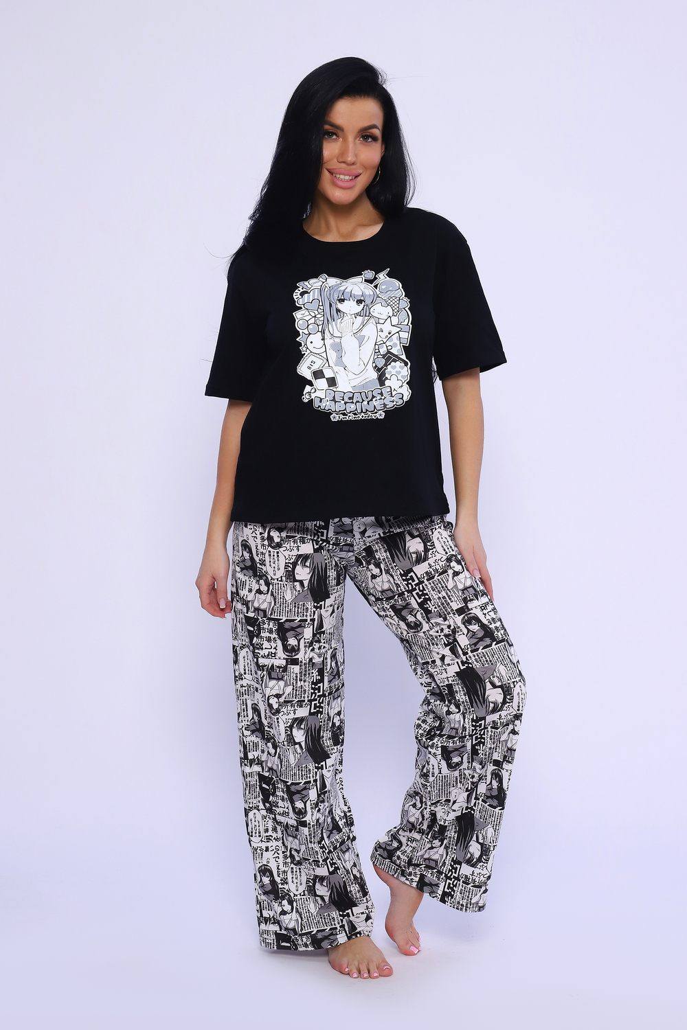 Костюм домашний, футболка прямого кроя с коротким рукавом и брюки свободного кроя.