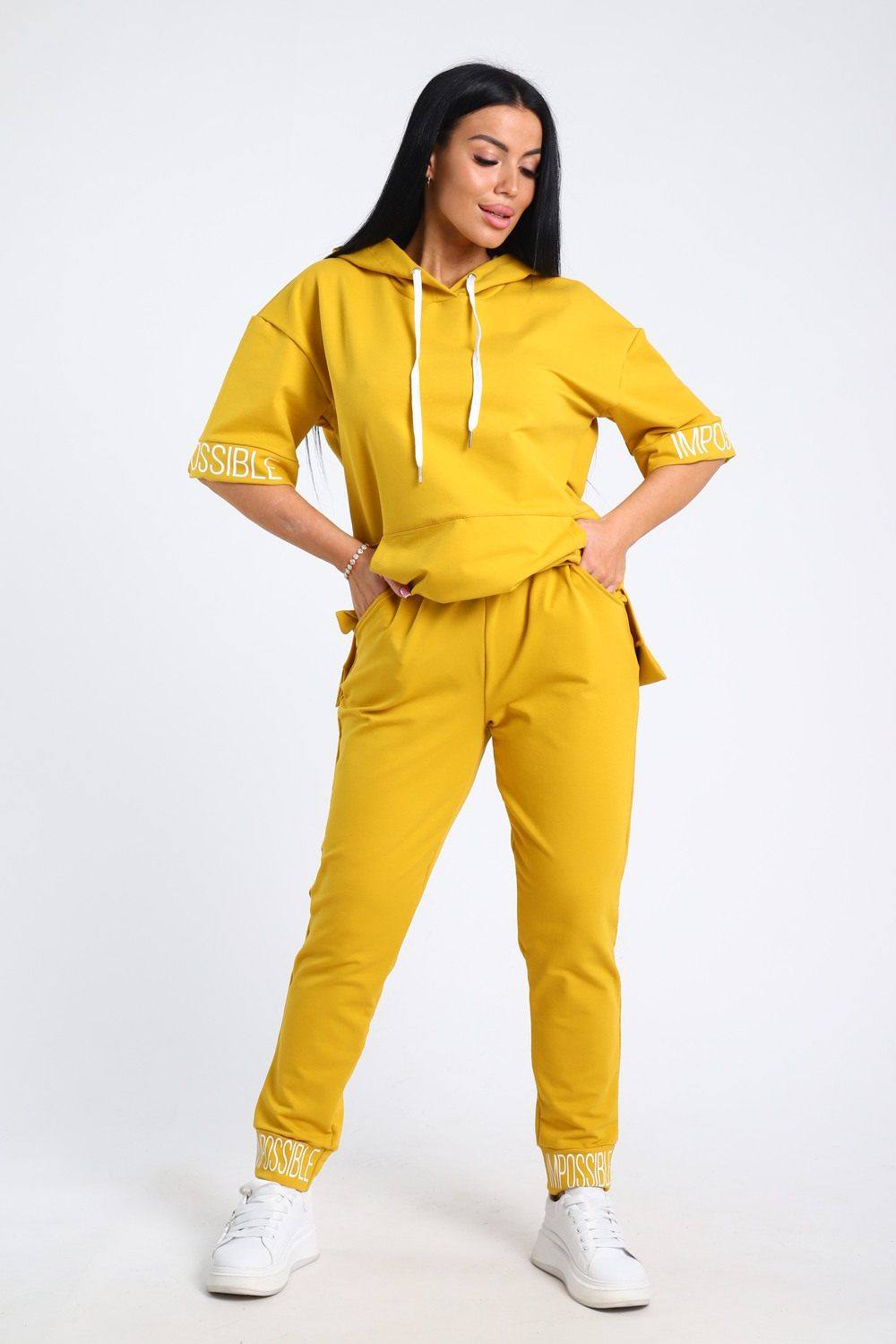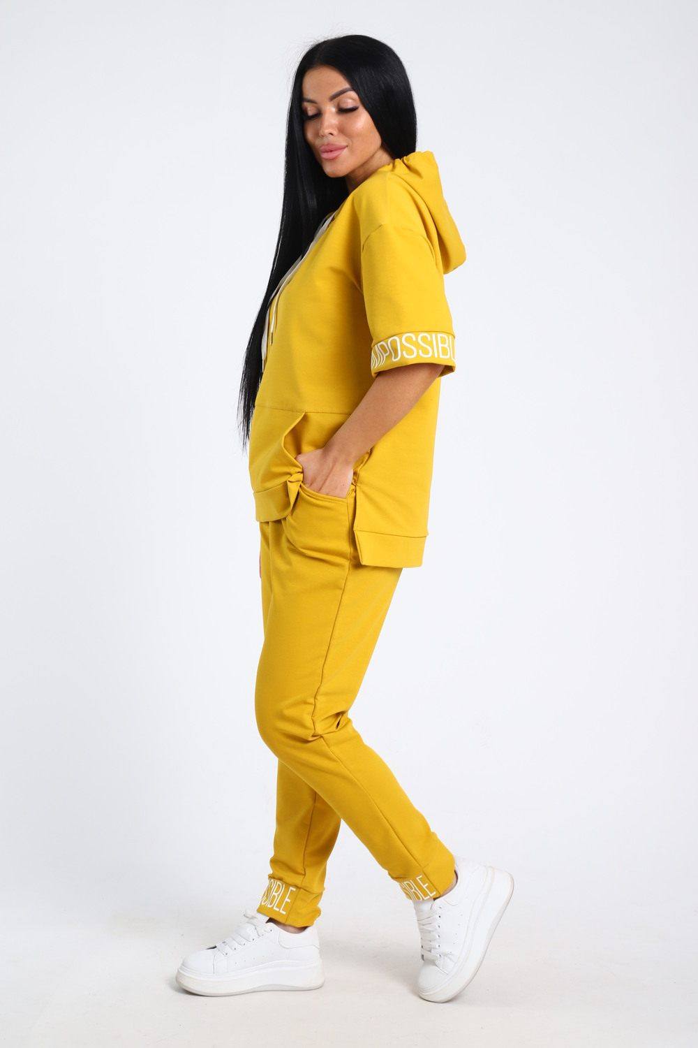 Костюм женский их футера 2 х нитки с лайкрой. Очень интересная модель, кофта удлинённая по бокам разрезы, рукава до локтя, на манжетах принт, карман кенгуру, брюки с карманами прямой посадки снизу на манжетах. На модели 48-50 размер. Удобство и комфорт вам обеспечены во время прогулок, путешествий и отдыха.