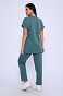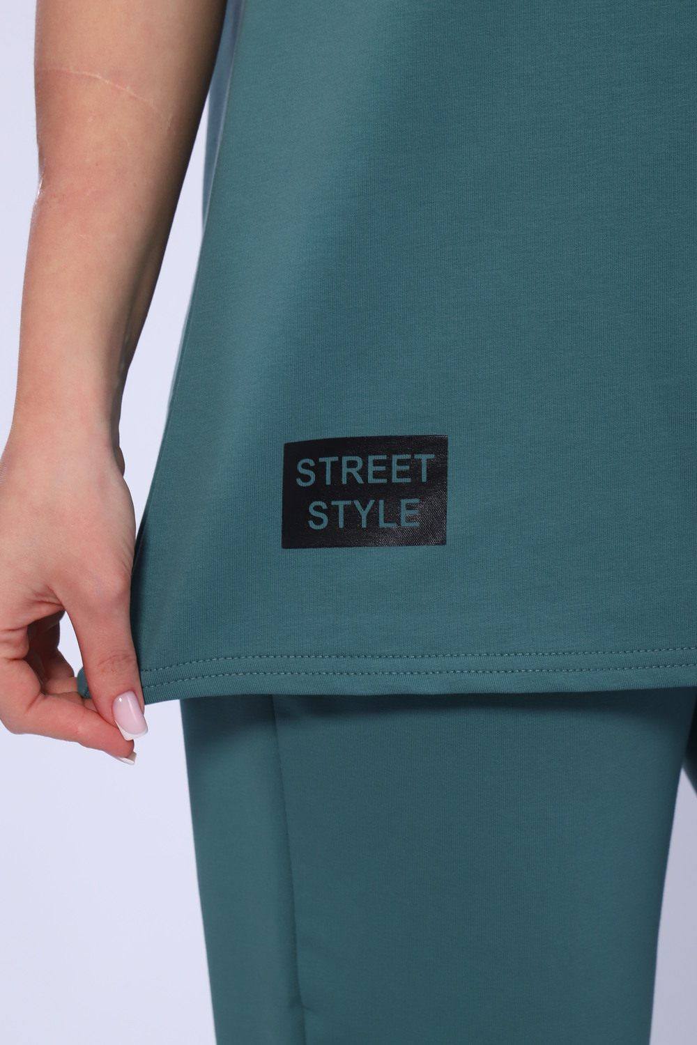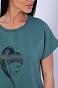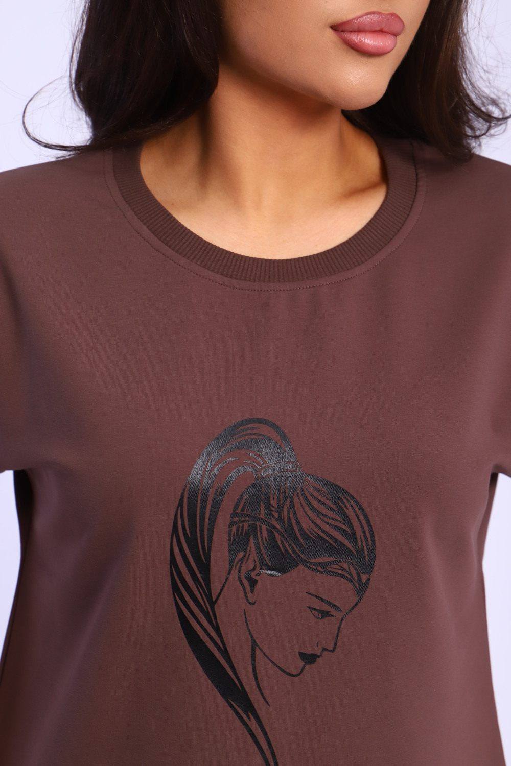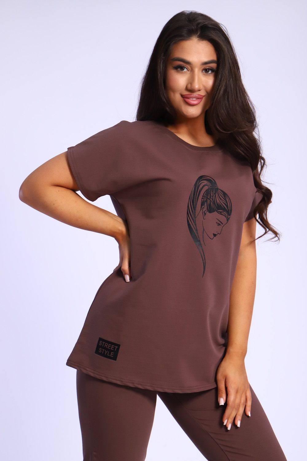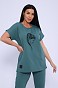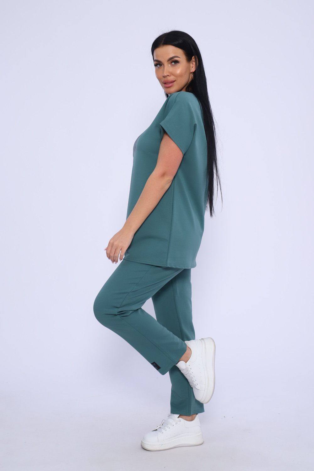 Легкий женский костюм прямого силуэта. Верх двойки - футболка с коротким рукавом и округлой горловиной. Футболка свободная с принтом. Низ - прямые брюки без карманов, пояс на резинке. Данная модель подойдет как и для повседневной носки, так и для дома. Удобный и приятный костюм. Рост модели на фото 165, размер 48.
