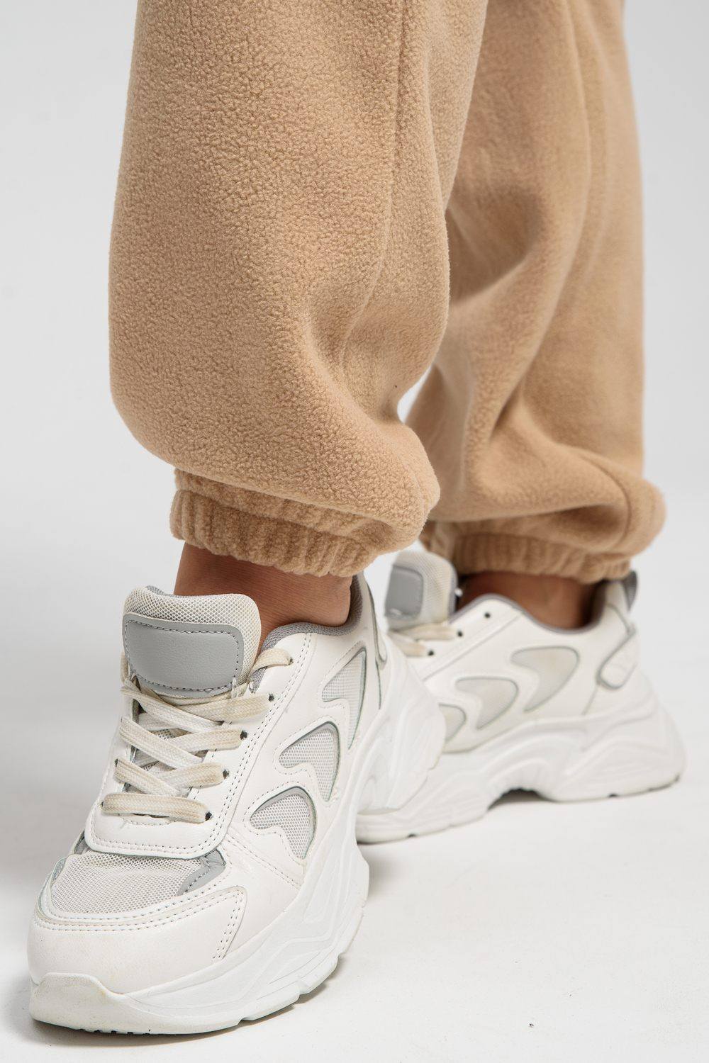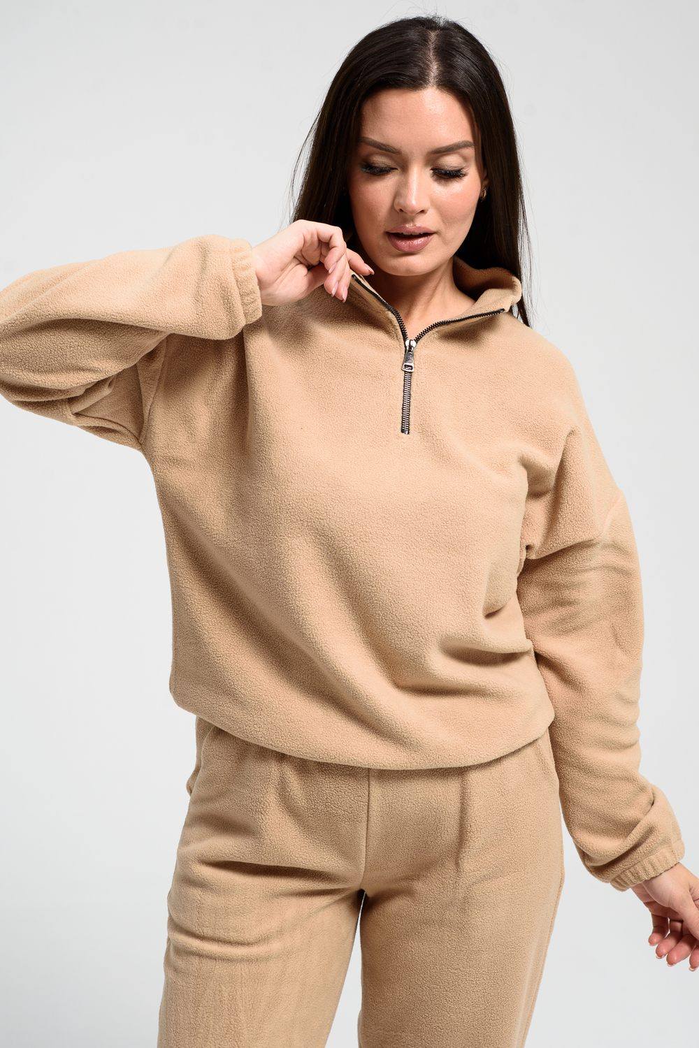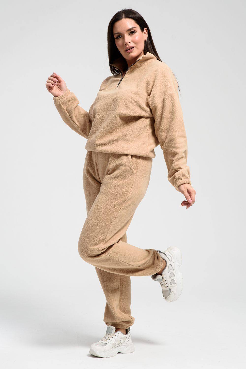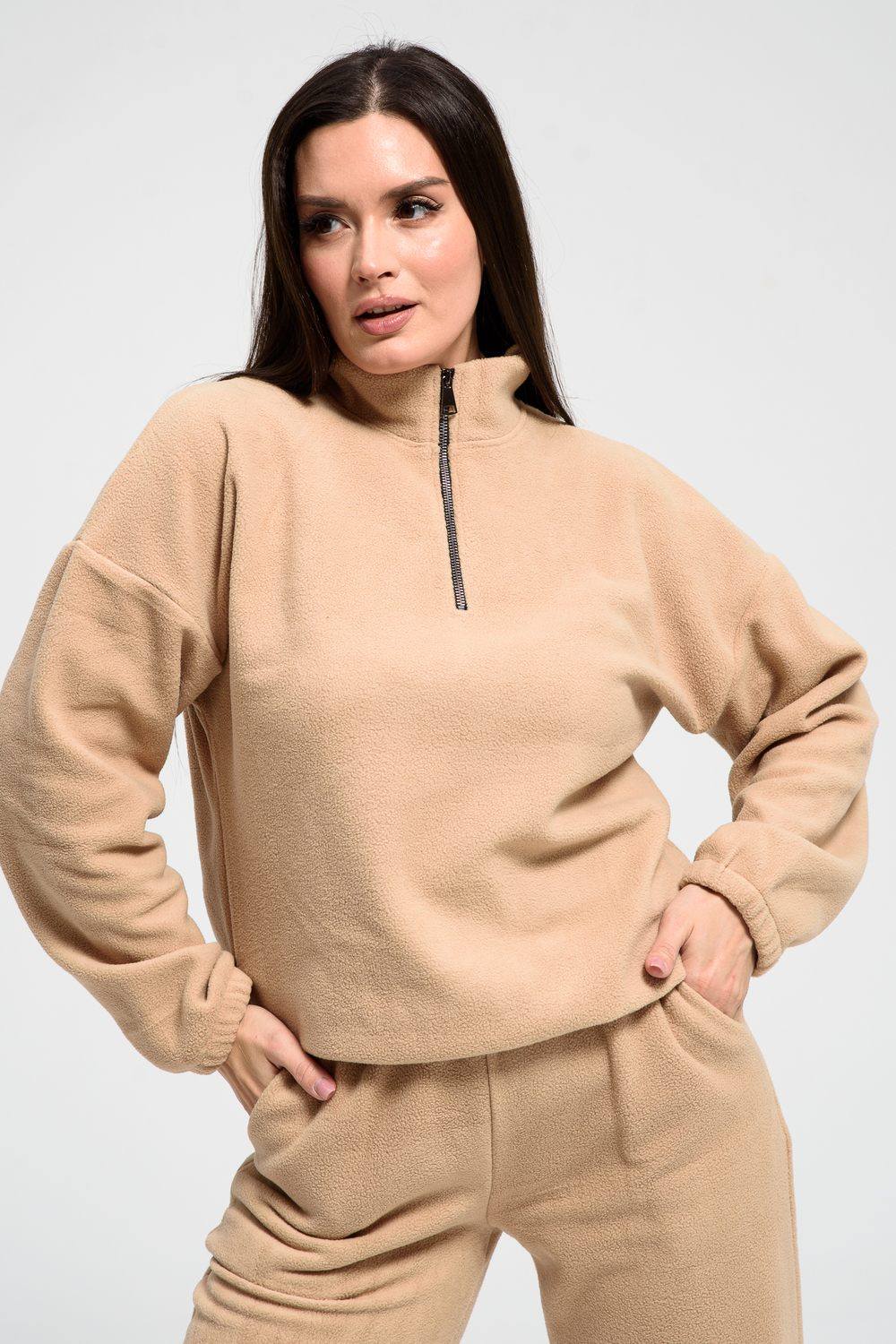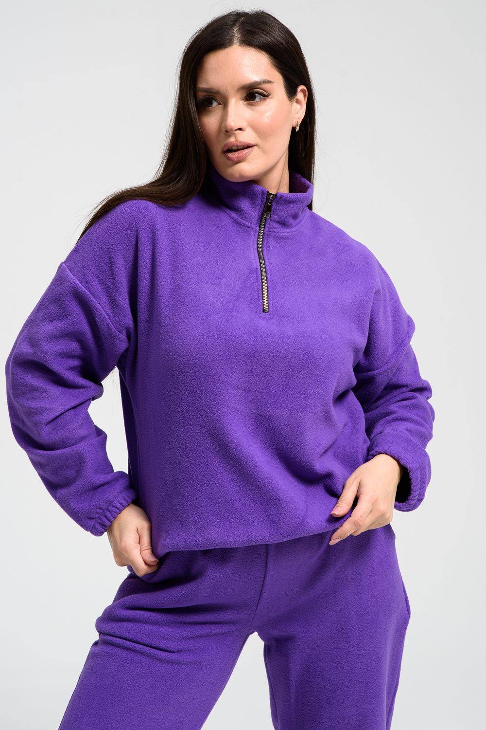 Женский спортивный костюм из теплой ткани - флис, прекрасный выбор на прохладную погоду, Верх - толстовка с горлом-стойкой и короткой молнией, понизу и на манжетах резинка, низ - брюки с карманами, пояс и низ штанов на резинке. Двойка подойдет для прогулок и дома.