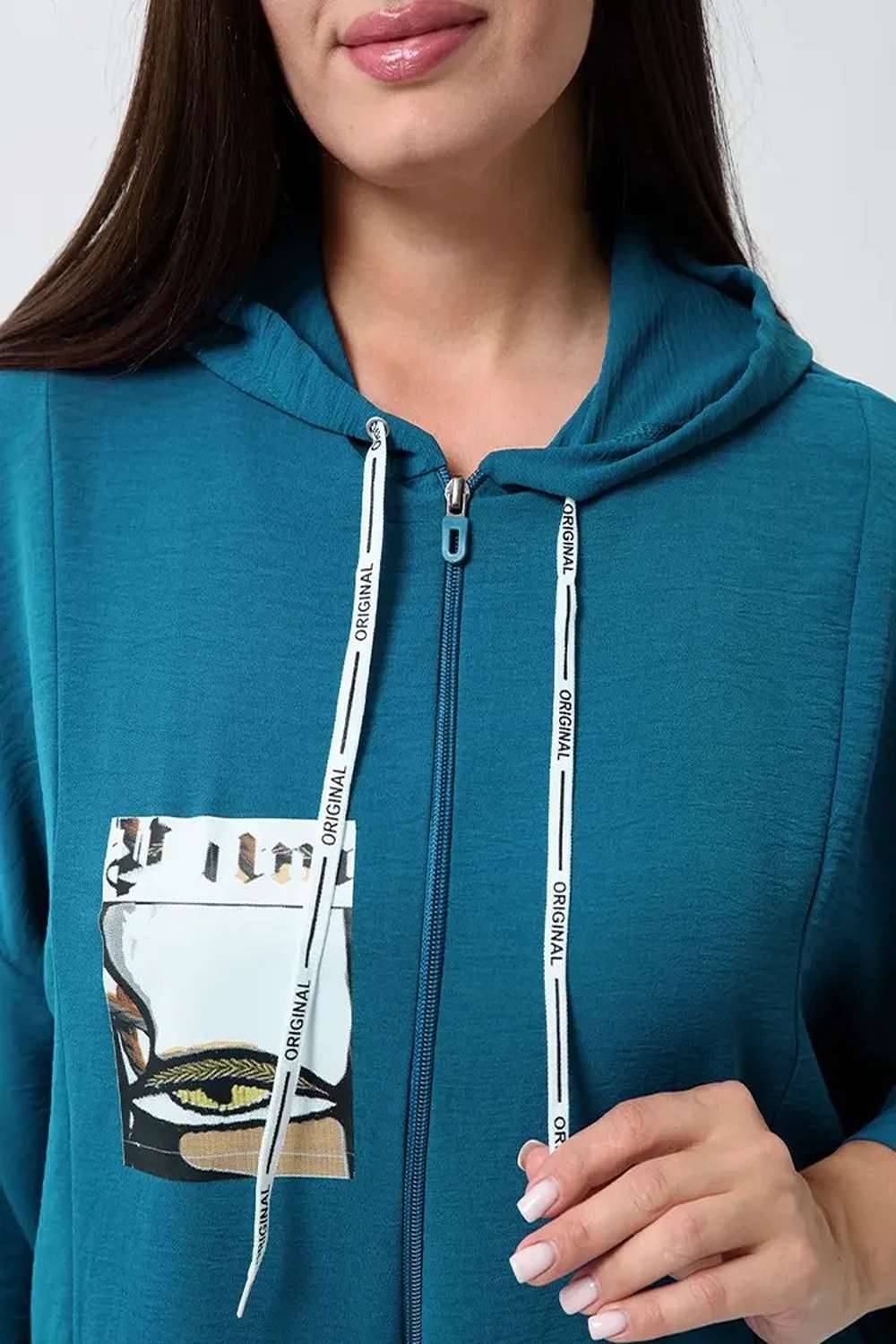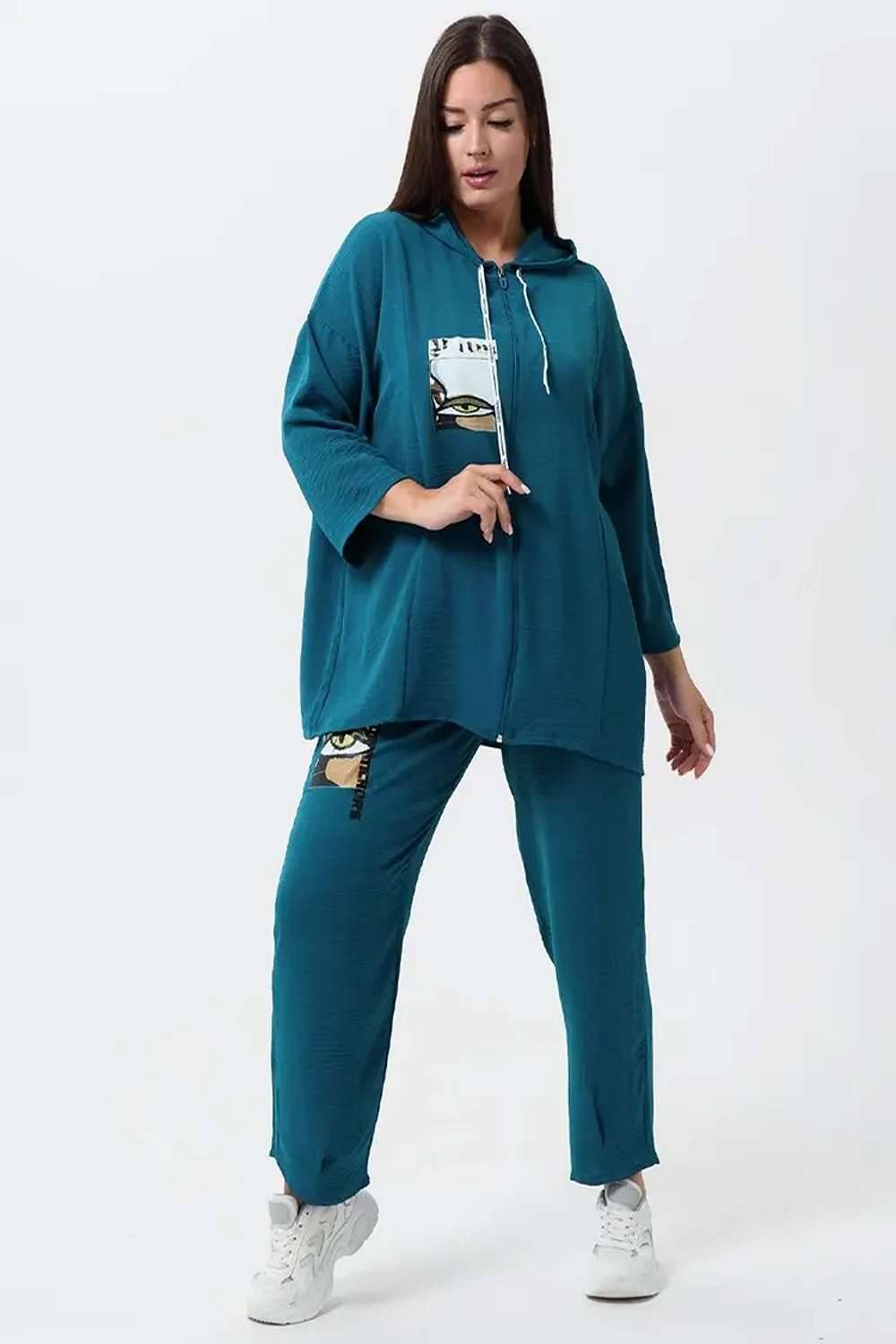Женский стильный костюм из легкой ткани - сингапур - самое то для жаркого лета. Вверх изделия - удлинненый оверсайз кофточка на молнии с капюшоном, рукава спущенные - длина до запястья (длина рукава указана от горловины). Низ - свободные брюки с карманами, пояс на резинке, снизу имеется защипка, которая слегка заужает штаны. Костюм декорирован принтом. Свободный и стильный, не сковывает движения. Двойка на каждый день в приятных расцветках - хорошая находка для вашего гардероба!