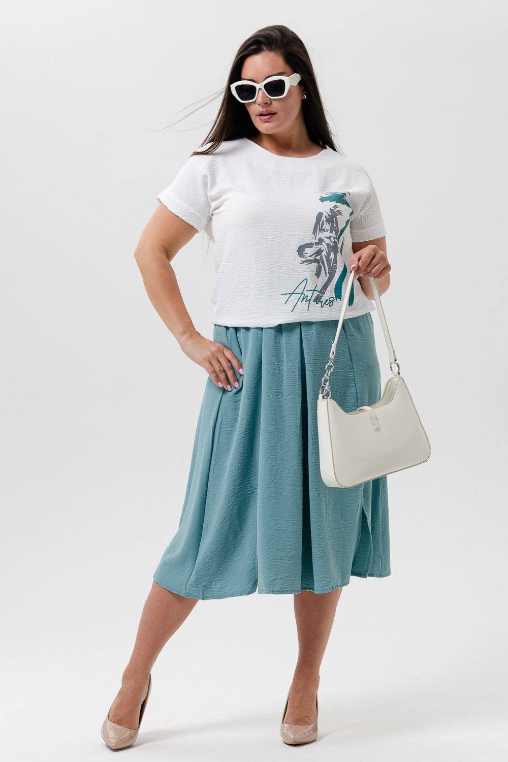 Женская двойка прямого силуэта. Верх комплекта в белом цвете с цветным принтом, короткий цельнокроеный рукав, низ футболки имеет свойство затягиваться, поэтому ее можно носить спущенную на юбку, а можно затянуть и оставить над ней, что подчеркнет вашу талию. Низ - свободная юбка двух цветов, с двумя разрезами снизу. Костюм повседневный и удобный, из легкой ткани сингапур, что хорошо для жаркого лета.