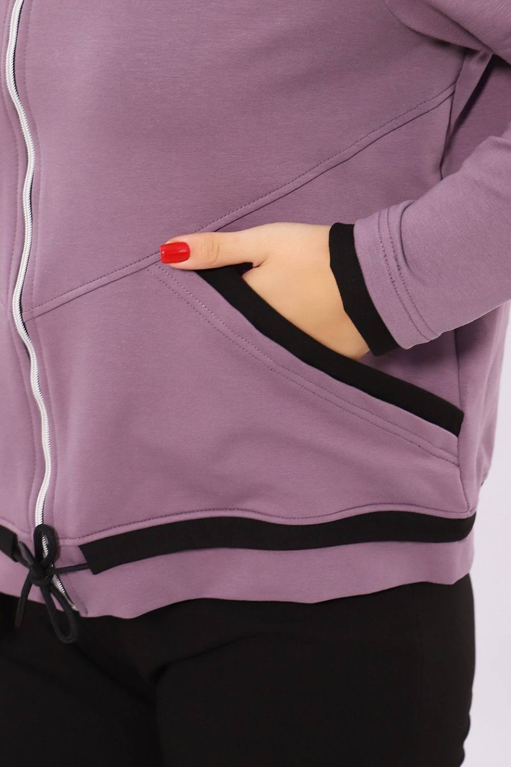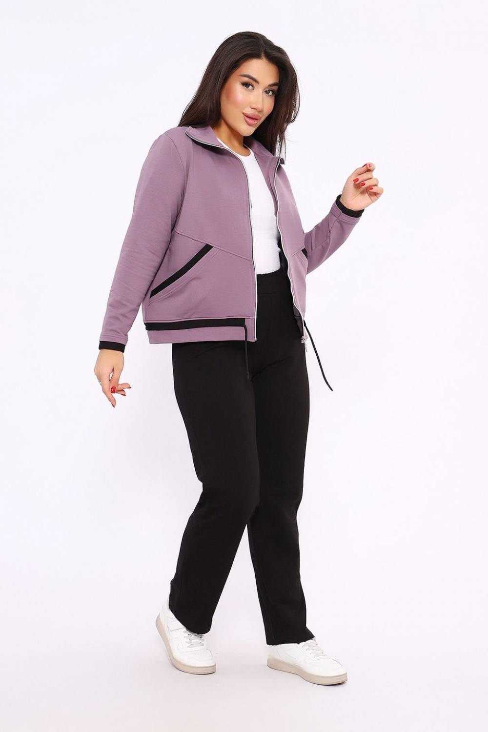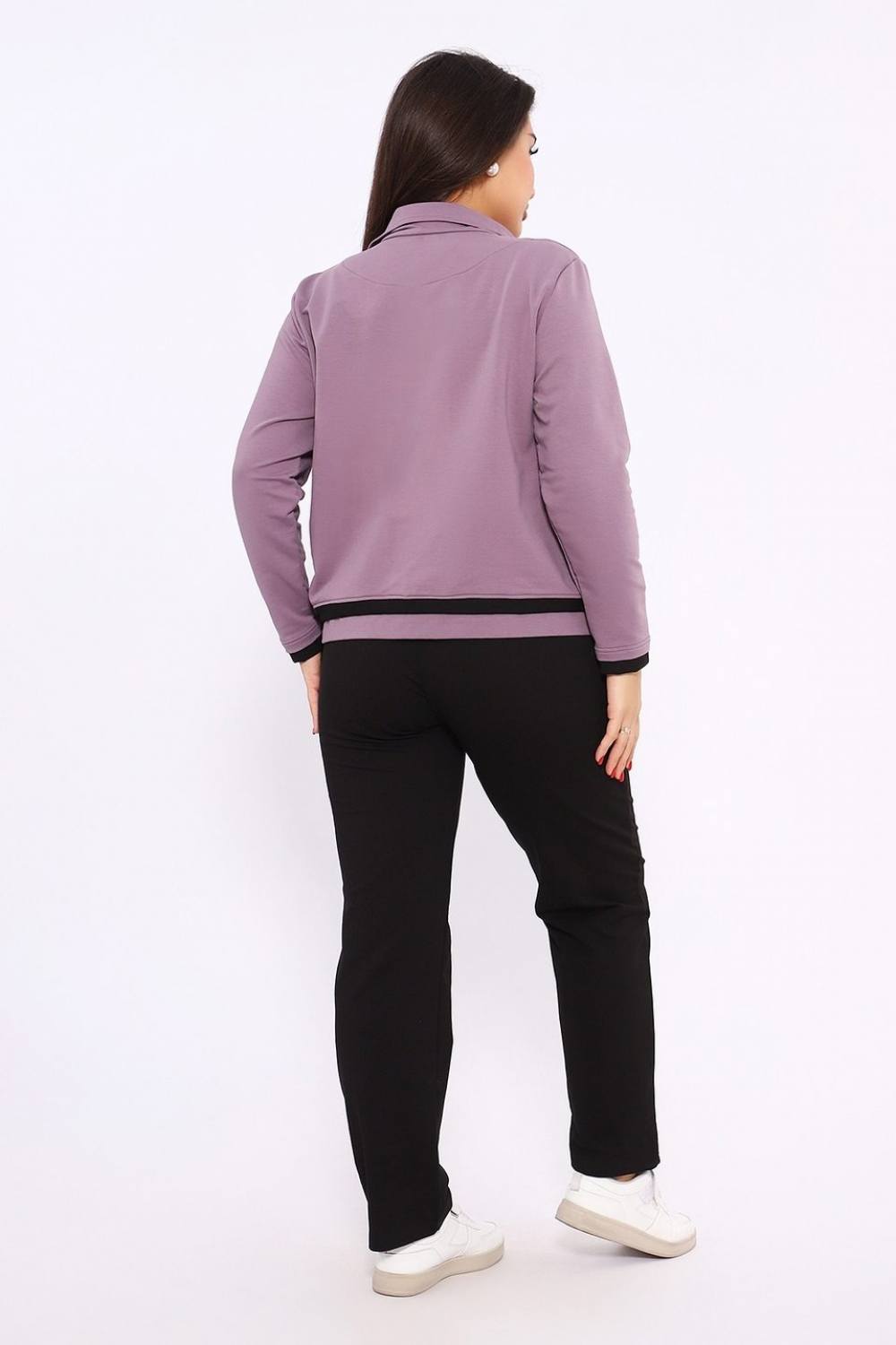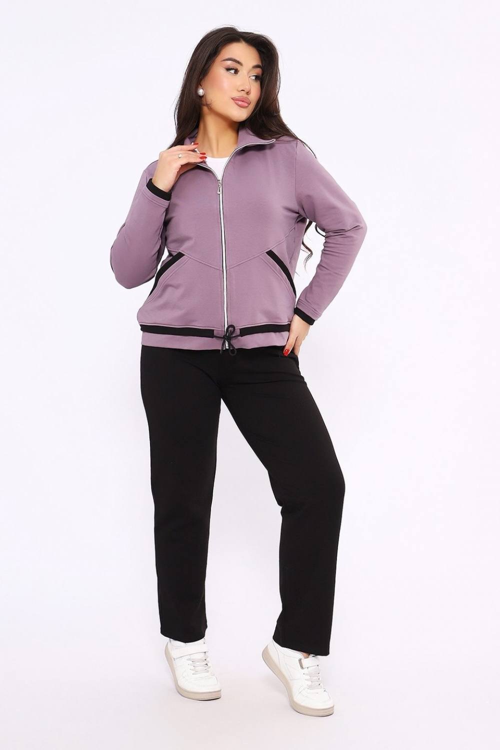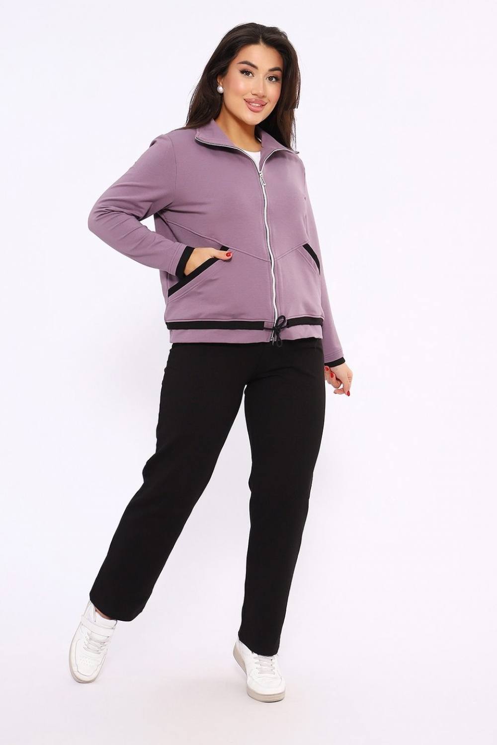 Костюм комбинированный из трикотажного полотна «футер 2-х нитка» с добавлением лайкры (Х/Б 70%, П/Э 24%, Эластан 6%) двух цветов. Толстовка на молнии, рукава длинные втачные с естественной линией плеча, воротник стойка. Низ изделия на притачном поясе. Полочка отрезная под углом к середине, в нижней части — карманы с наклонным входом. Толстовка декорирована полосками контрастного материала, из которого выполнены брюки. Отделочным материалом подшиты рукава, входы карманов, кулиска по линии втачивания пояса. В кулиске — затягивающийся шнурок. Брюки прямые, полуприлегающего кроя. Пояс на резинке.