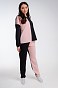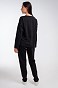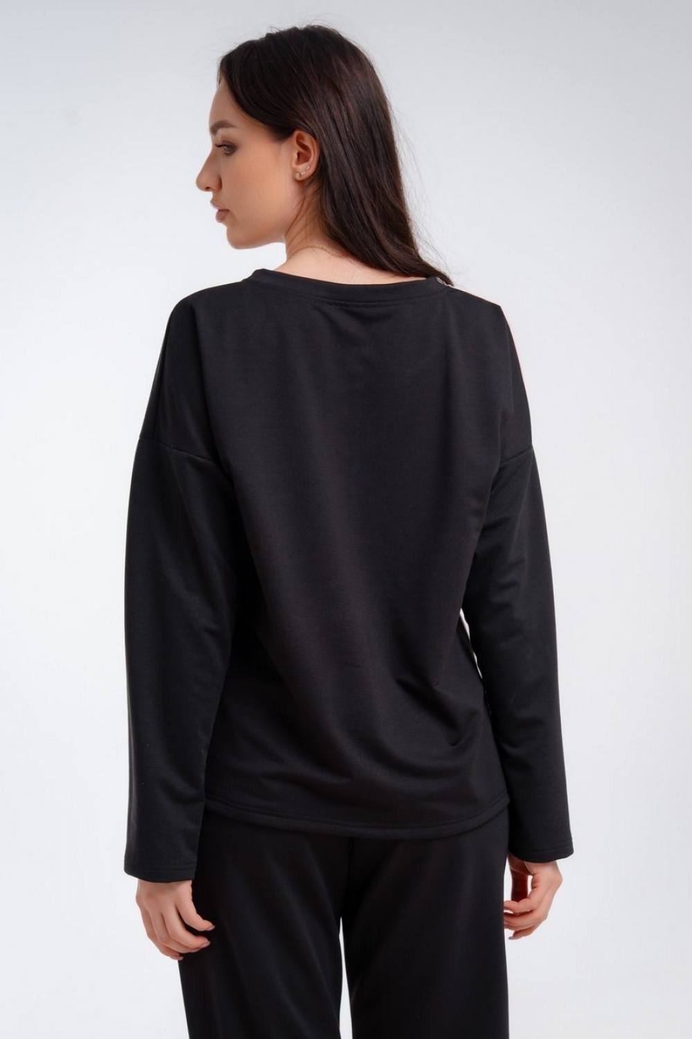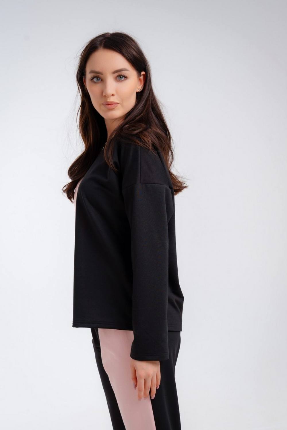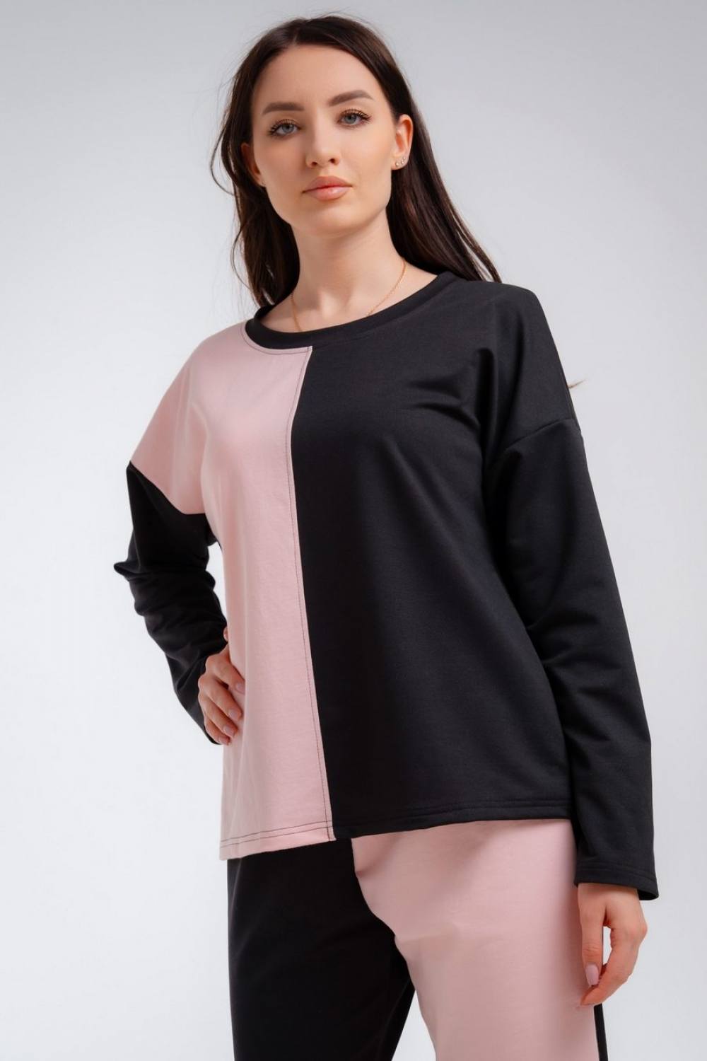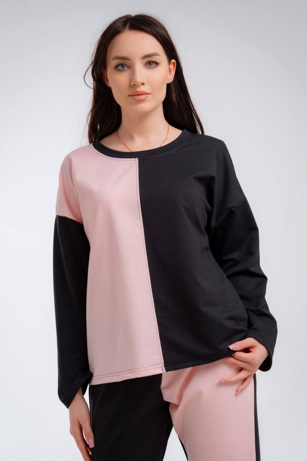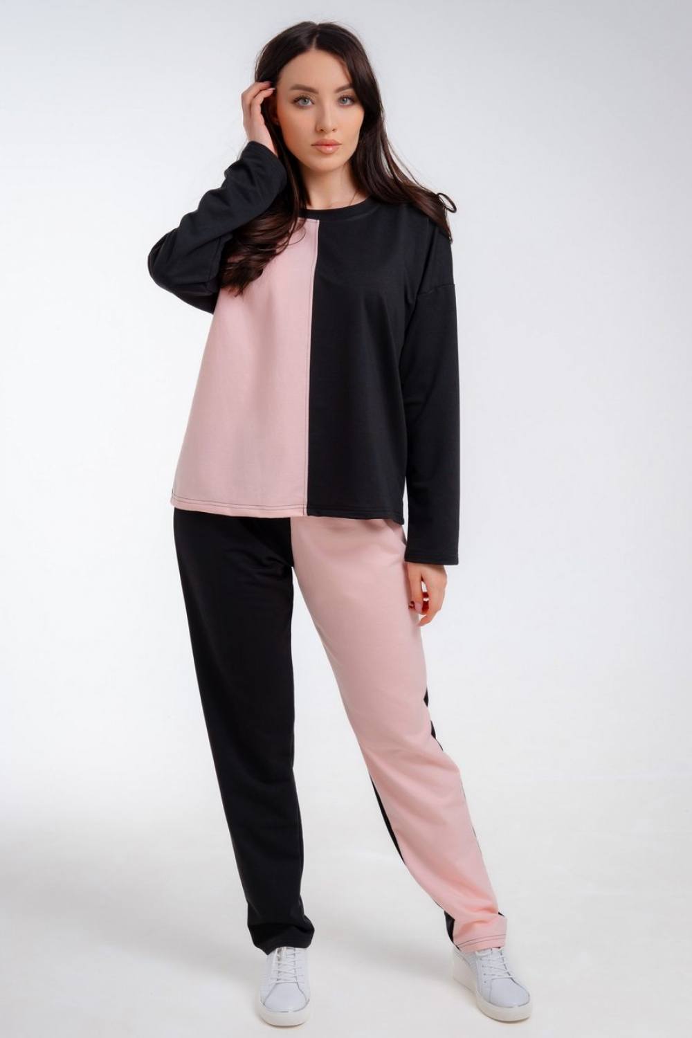 Комбинированный оригинальный женский костюм с брюками из трикотажного полотна «футер 2-х нитка» с добавлением лайкры (Х/Б 75%, П/Э 20%, Лайкра 5%) двух цветов. Лонгслив прямой, свободного кроя, просторная круглая горловина, обработанная притачной обтачкой. Рукава длинные втачные на спущенном плече. Одна половинка полочки выполнена из ткани-компаньона контрастного цвета. Брюки прямые, свободного кроя, на цельнокроеном поясе с резинкой в подгибке, без карманов. Передняя деталь одной из брючин также выполнена из ткани-компаньона.