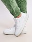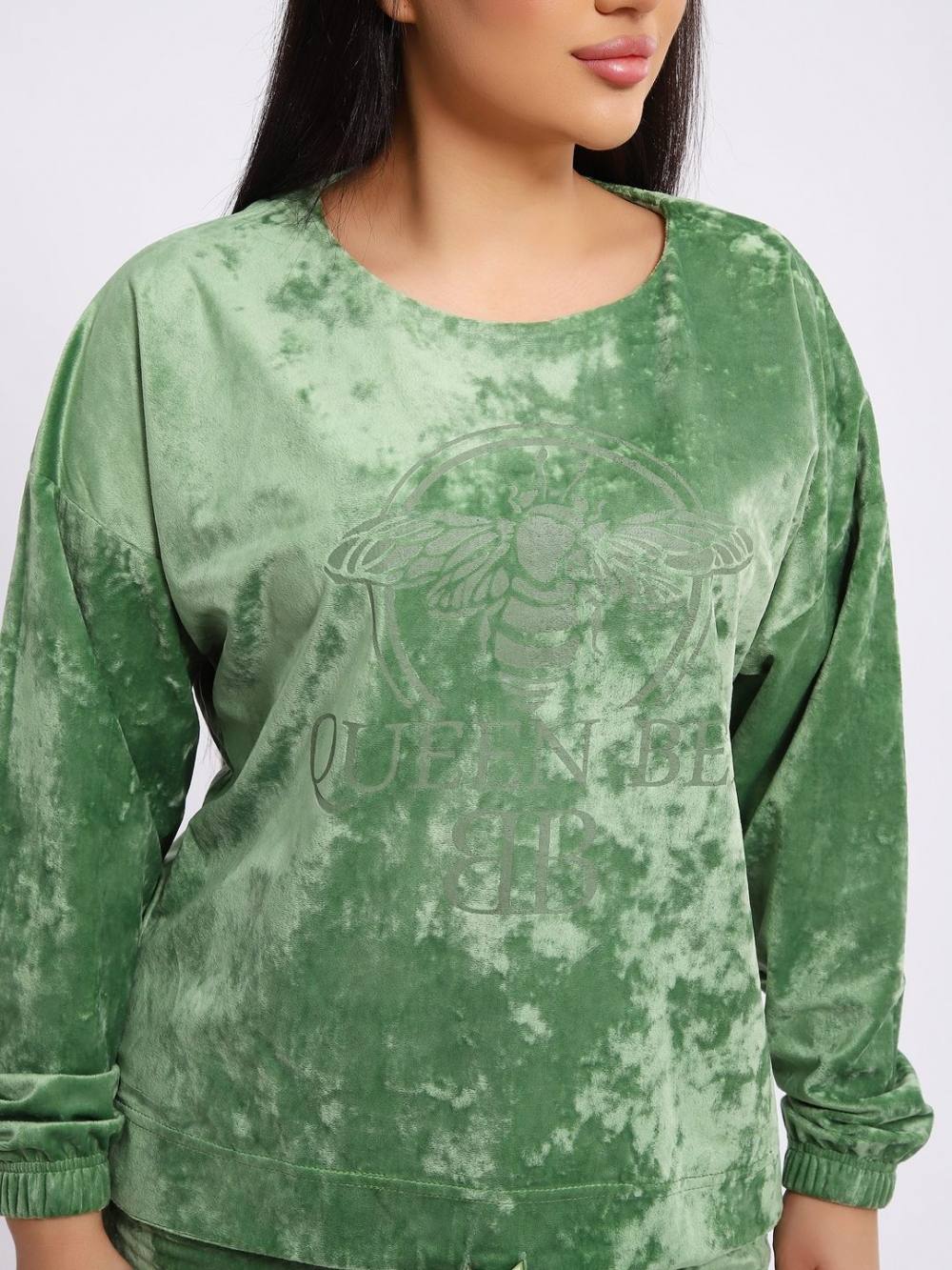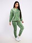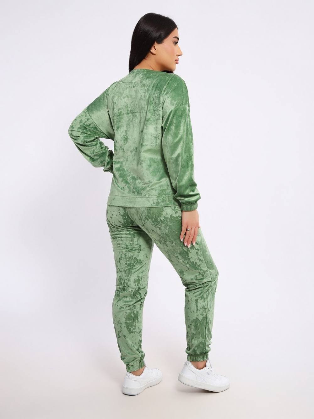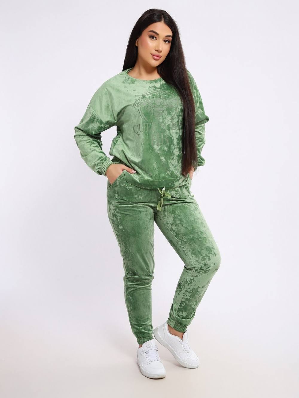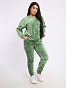 Женский костюм с брюками из трикотажного полотна «велюр» (100% полиэстер). Джемпер с просторным круглым вырезом, прямой, свободного кроя. Рукава длинные втачные на спущенном плече. Цельнокроеные манжеты с резинкой в подгибке. Низ толстовки посажен на пояс с затягивающейся атласной лентой в кулиске. Полочку декорирует ненавязчивый однотонный графический принт в стиле крупного логотипа. Брюки прямые полуприлегающего кроя, притачной пояс с широкой резинкой внутри, простроченный на многоигольной машине. Брючные карманы с наклонными входами, с отрезным бочком. Низ брюк на цельнокроеных манжетах с резинкой внутри.
