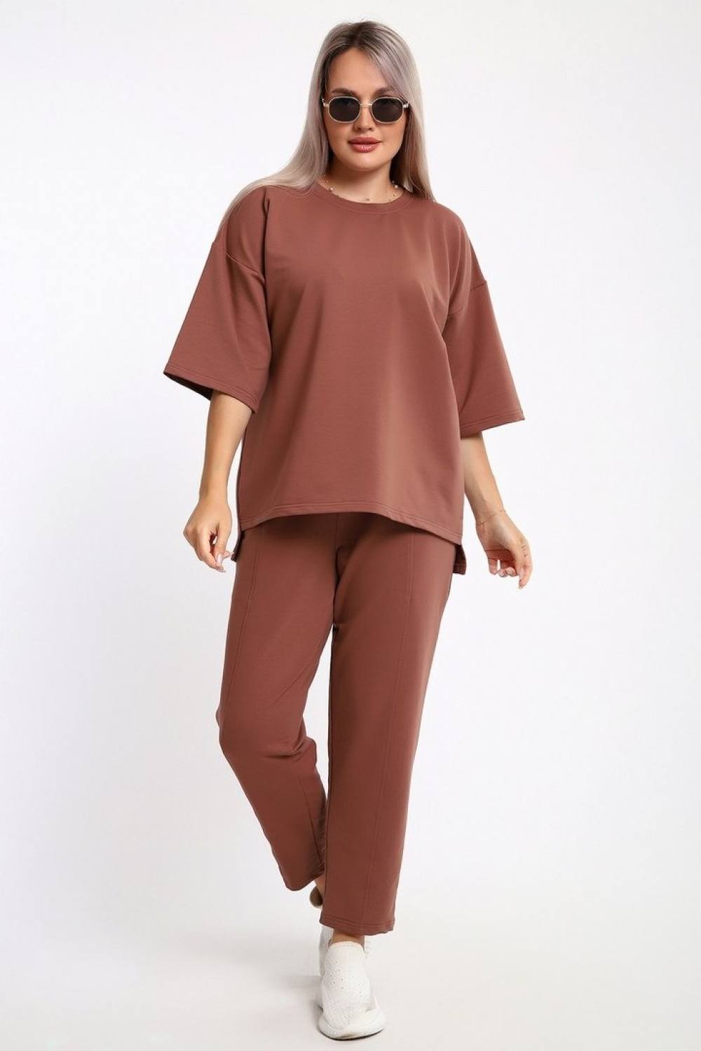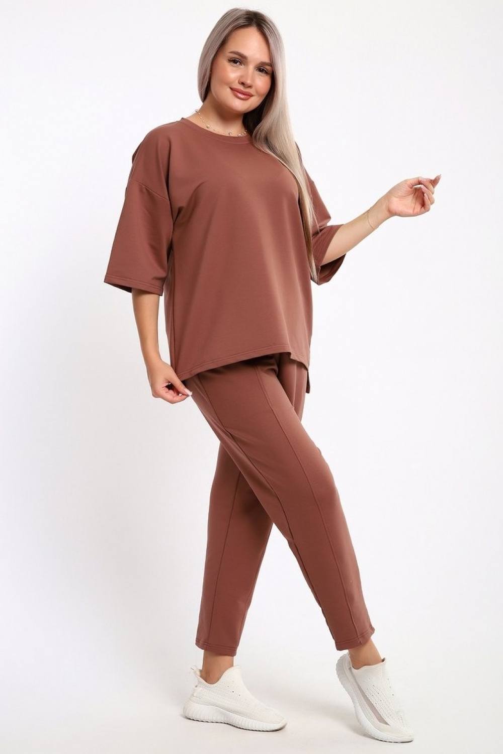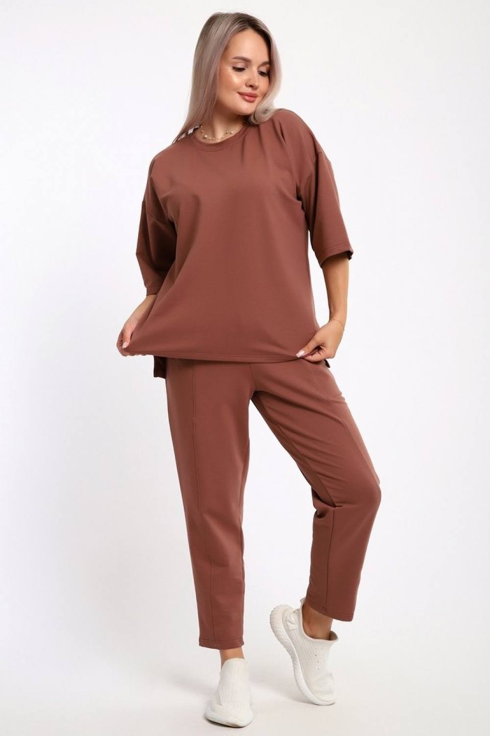Удобный женский костюм с брюками, свободного кроя, выполнен из однотонного трикотажного полотна «футер 2-х нитка» (Х/Б 70%, П/А 24%, Эластан 6%). Костюм прекрасно подходит для прогулок и повседневной носки. Брюки прямые, зауженные книзу, на широком притачном поясе с резинкой внутри обработан на многоигольной поясной машине. Посадка высокая. Передние детали — с отрезным бочком, в котором размещены внутренние карманы с горизонтальными входами. Футболка оверсайз с втачными короткими рукавами на спущенном плече. Длина рукавов ниже локтя. Круглый вырез горловины. Спинка немного длиннее полочки со ступенькой внизу бокового шва.