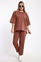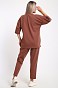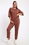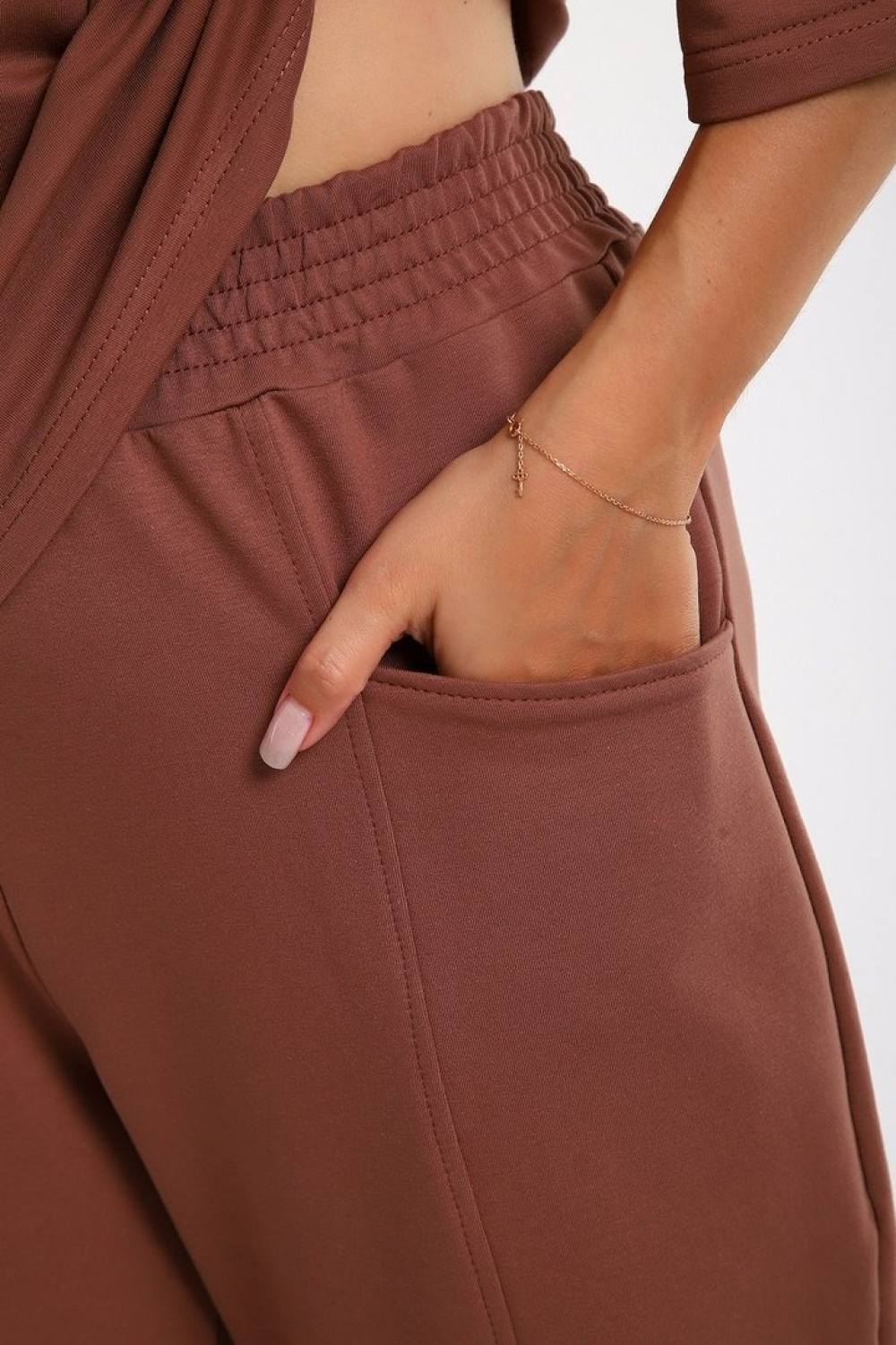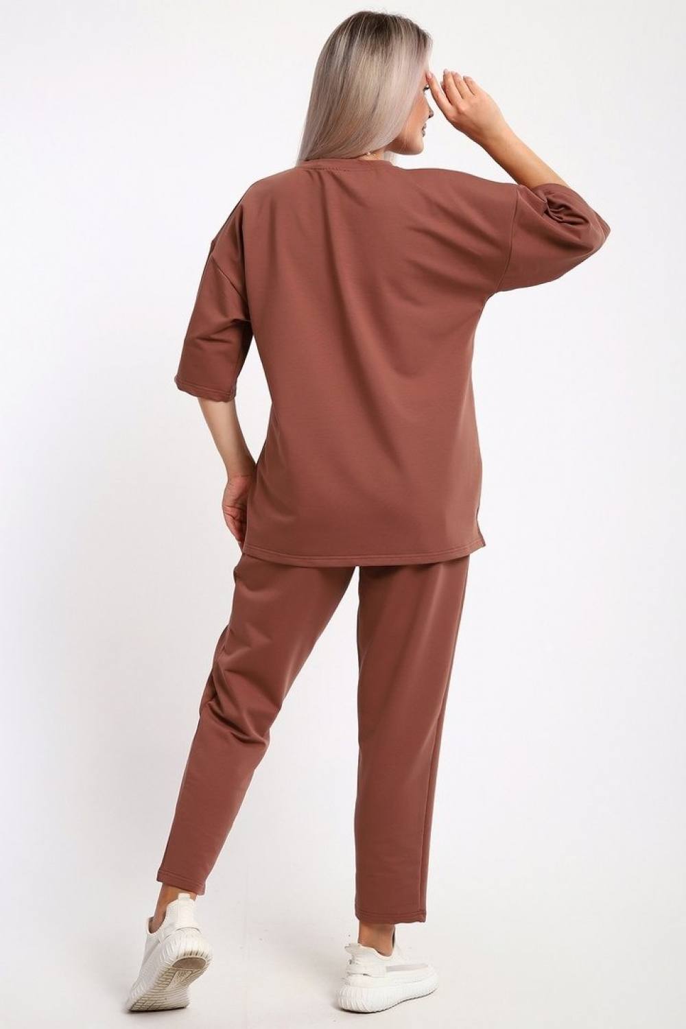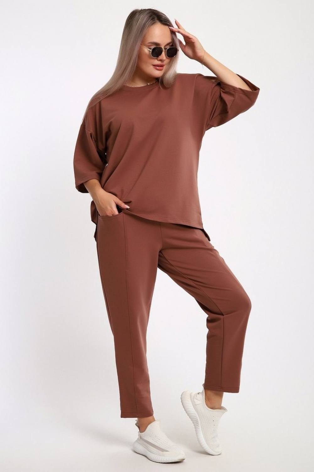 Удобный женский костюм с брюками, свободного кроя, выполнен из однотонного трикотажного полотна «футер 2-х нитка» (Х/Б 70%, П/А 24%, Эластан 6%). Костюм прекрасно подходит для прогулок и повседневной носки. Брюки прямые, зауженные книзу, на широком притачном поясе с резинкой внутри обработан на многоигольной поясной машине. Посадка высокая. Передние детали — с отрезным бочком, в котором размещены внутренние карманы с горизонтальными входами. Футболка оверсайз с втачными короткими рукавами на спущенном плече. Длина рукавов ниже локтя. Круглый вырез горловины. Спинка немного длиннее полочки со ступенькой внизу бокового шва.