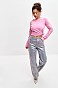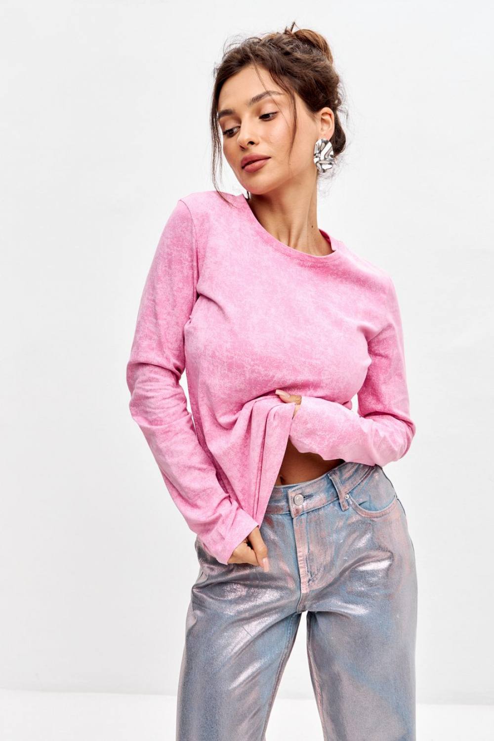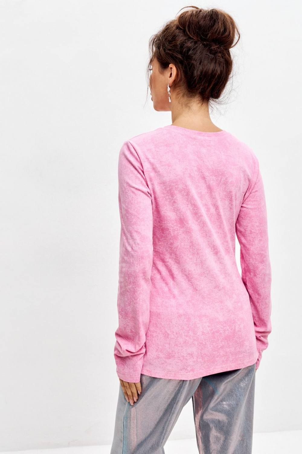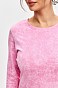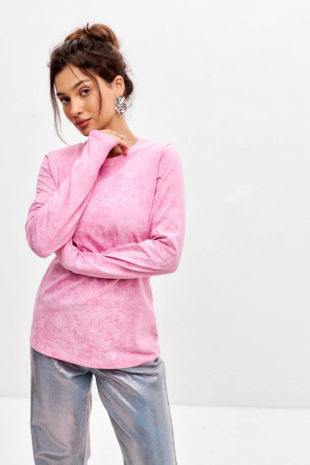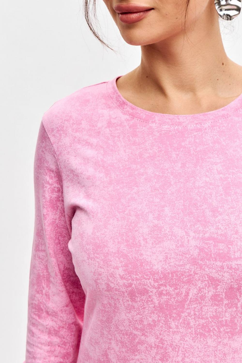 Лонгслив с абстрактным рисунком "варенка" выполнен из трикотажного полотна "кулирка" (100% хлопок). Круглый вырез горловины с притачной бейкой, отстроченный по линии втачивания. Рукава удлиненные, втачные, с естественной линией плеча. Низ рукава и низ изделия обработан с подгибкой на плоскошовной машине.