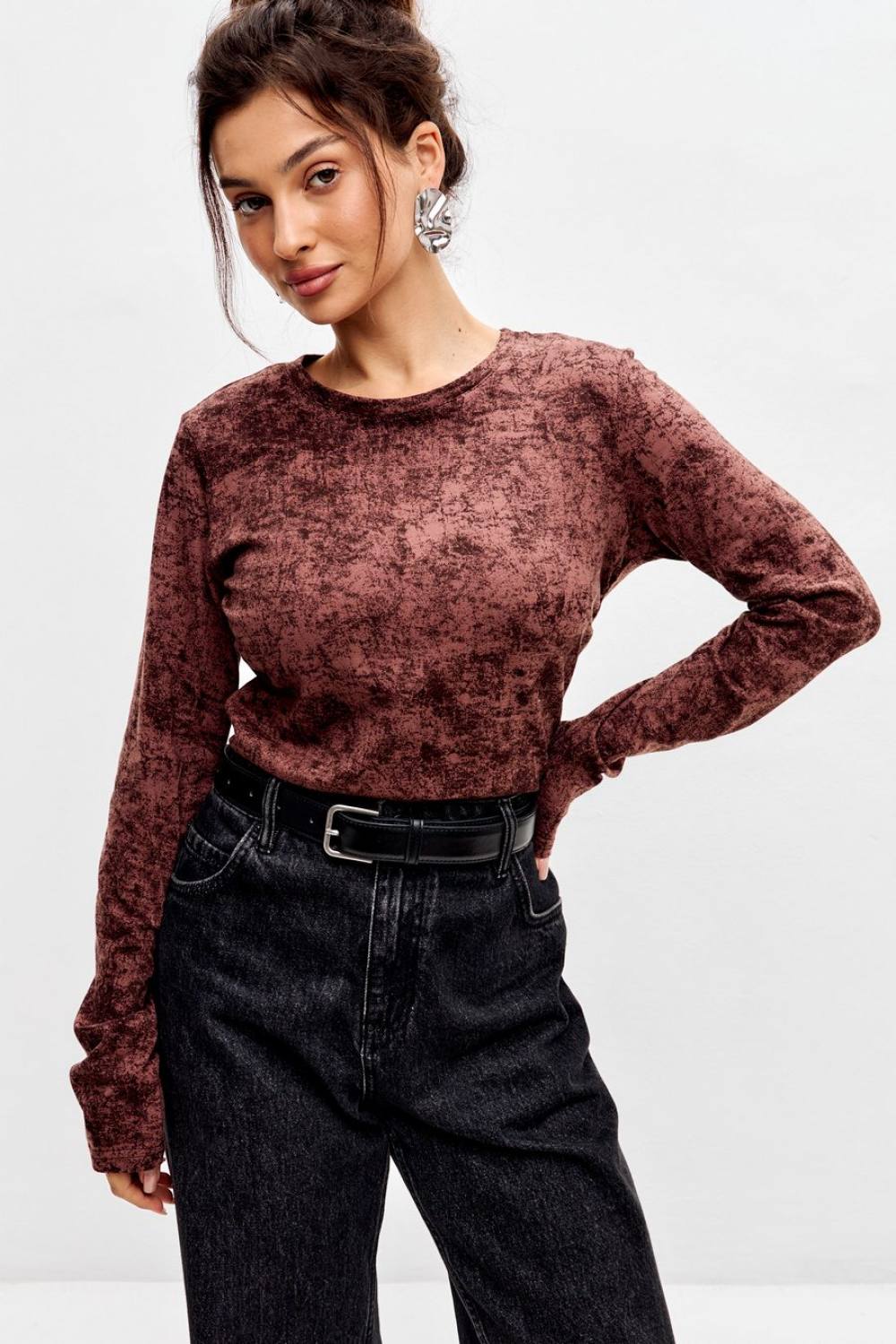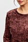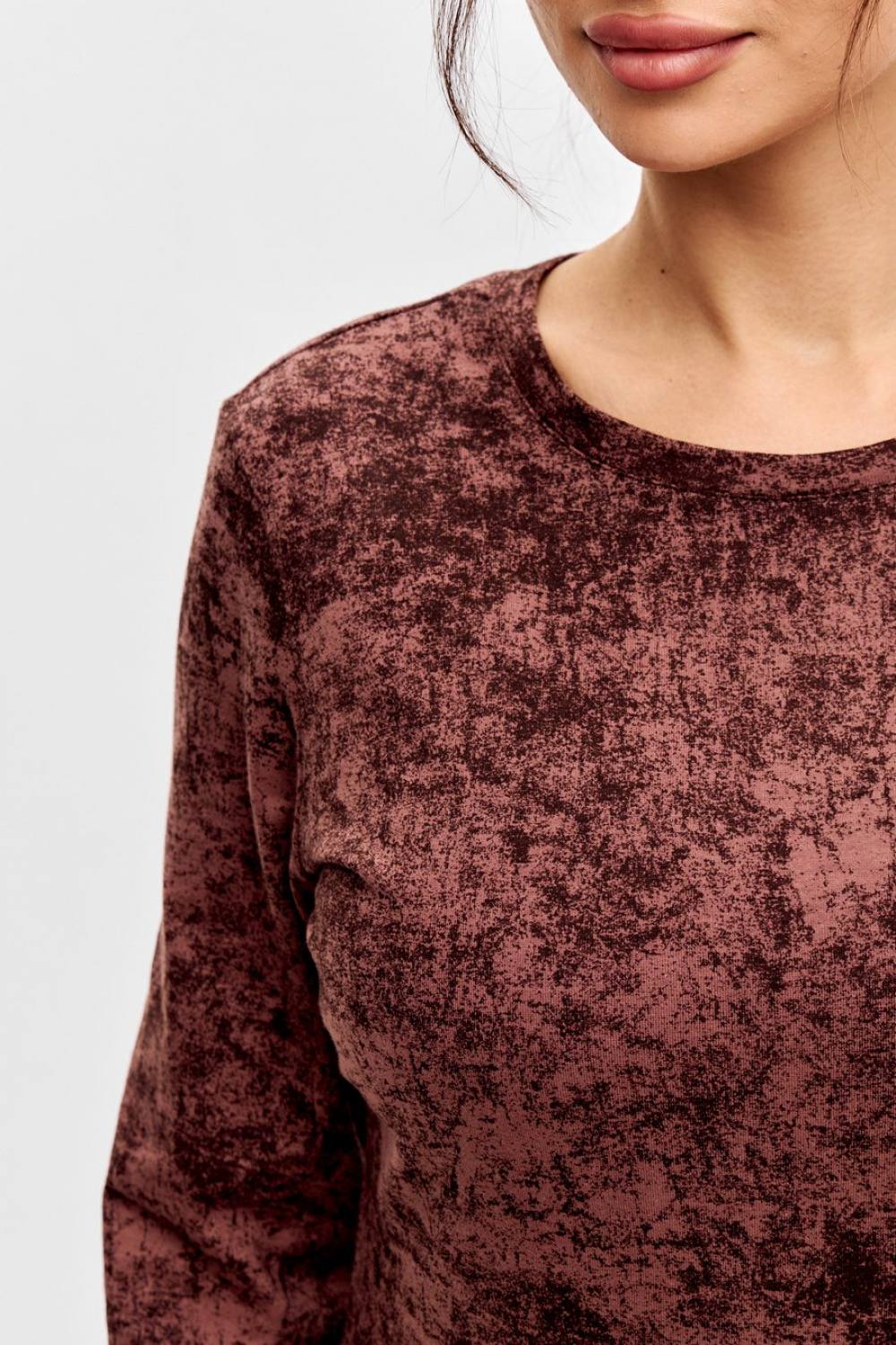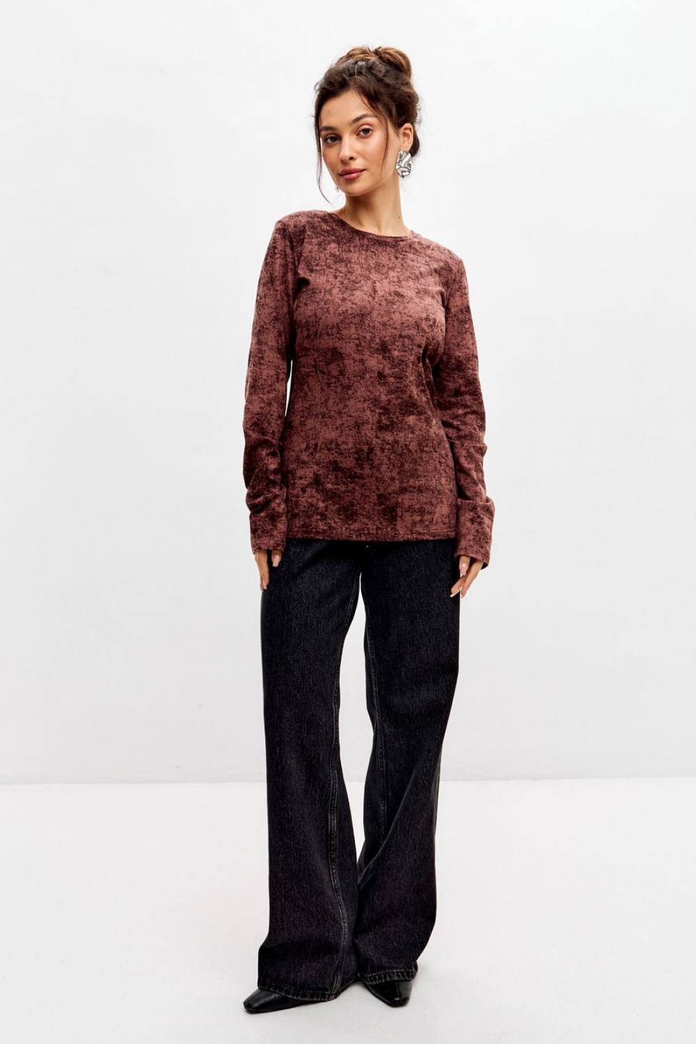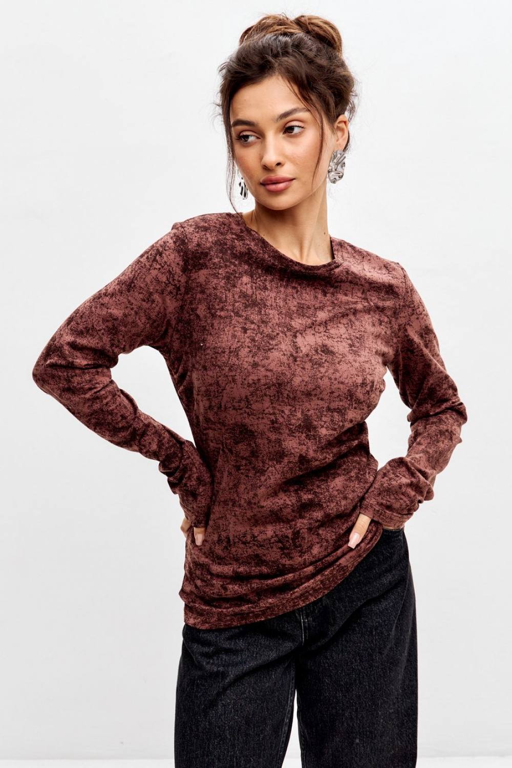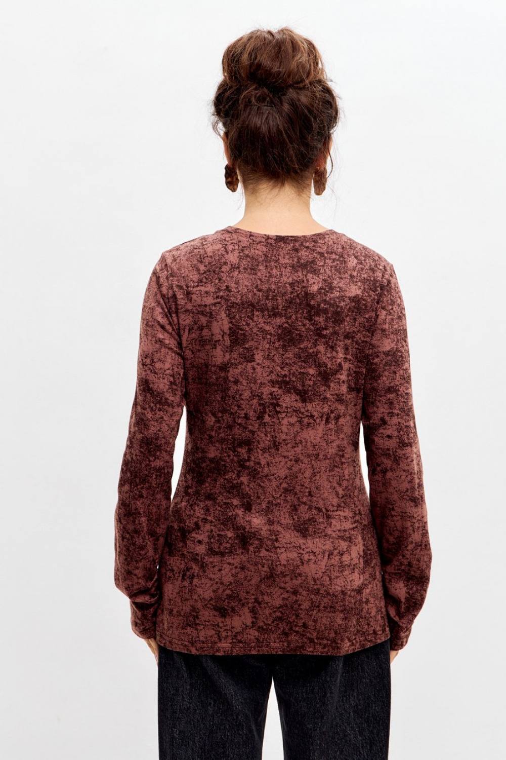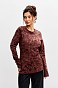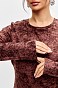 Лонгслив с абстрактным рисунком «варенка» выполнен из трикотажного полотна «кулирка» (100% хлопок). Лонгслив прямой, полуприлегающего кроя. Полочка на уровне груди присобрана в боковых швах. Круглый вырез горловины обработан притачной бейкой и отстрочен по линии втачивания. Рукава удлиненные, втачные, с естественной линией плеча. Низ рукава и низ изделия обработан с подгибкой на плоскошовной машине.