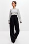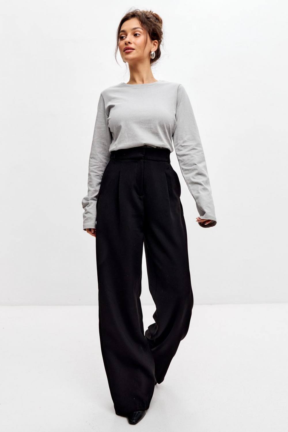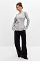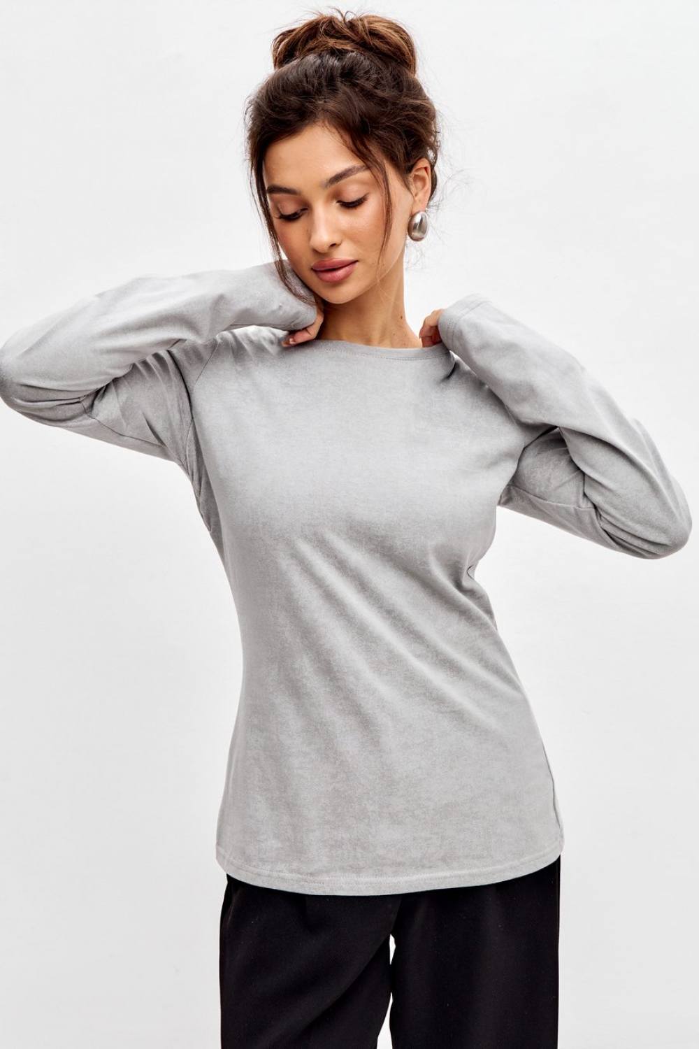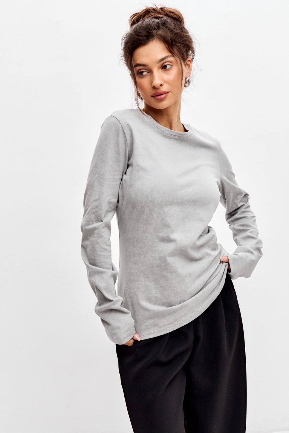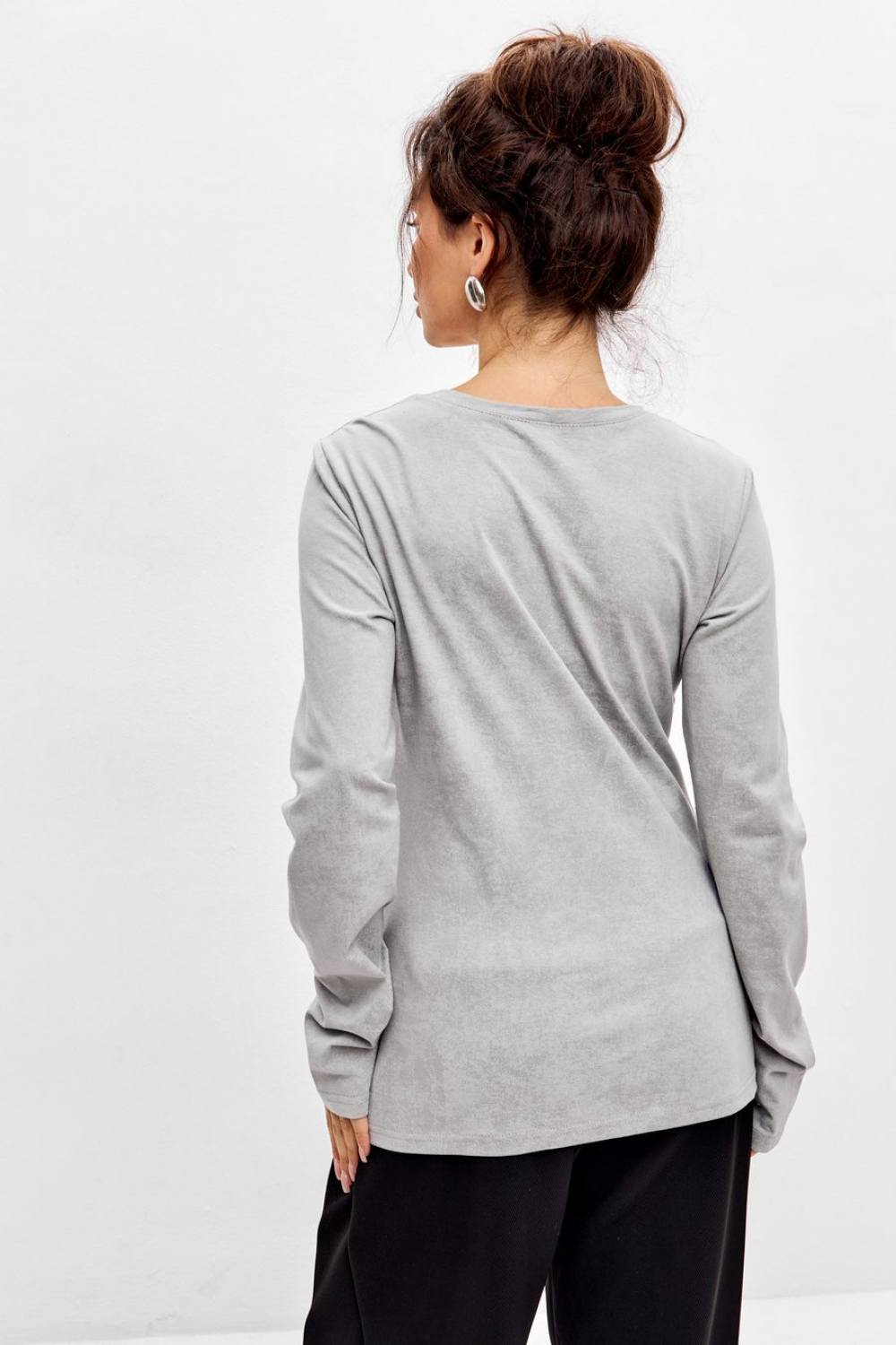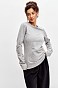 Лонгслив с абстрактным рисунком «варенка» выполнен из трикотажного полотна «кулирка» (100% хлопок). Лонгслив прямой, полуприлегающего кроя. Полочка на уровне груди присобрана в боковых швах. Круглый вырез горловины обработан притачной бейкой и отстрочен по линии втачивания. Рукава удлиненные, втачные, с естественной линией плеча. Низ рукава и низ изделия обработан с подгибкой на плоскошовной машине.