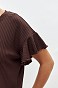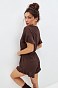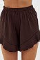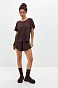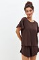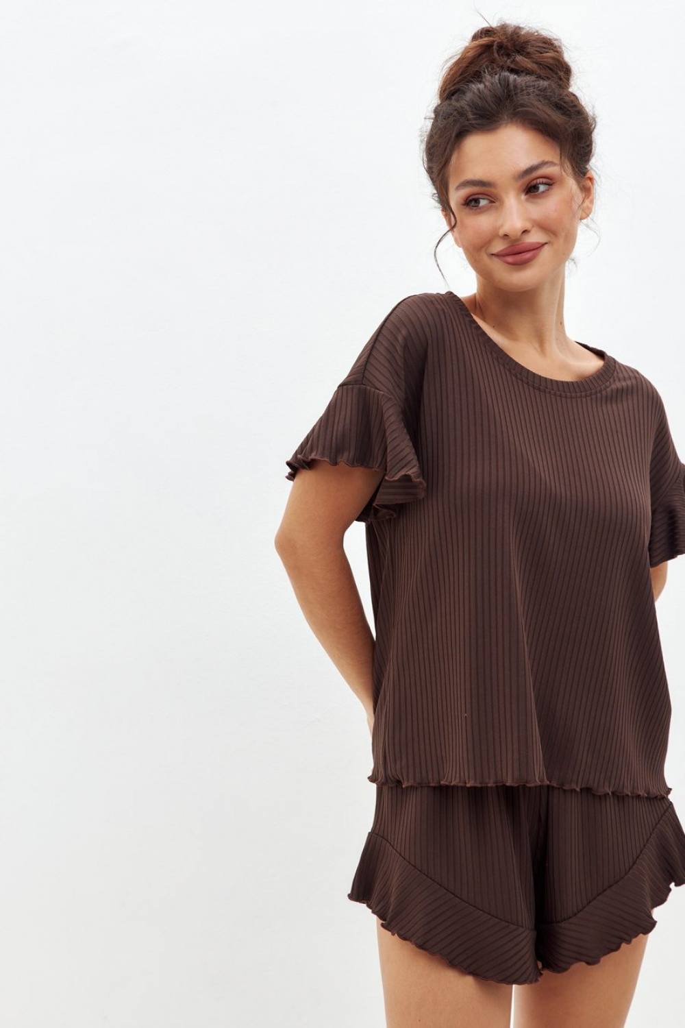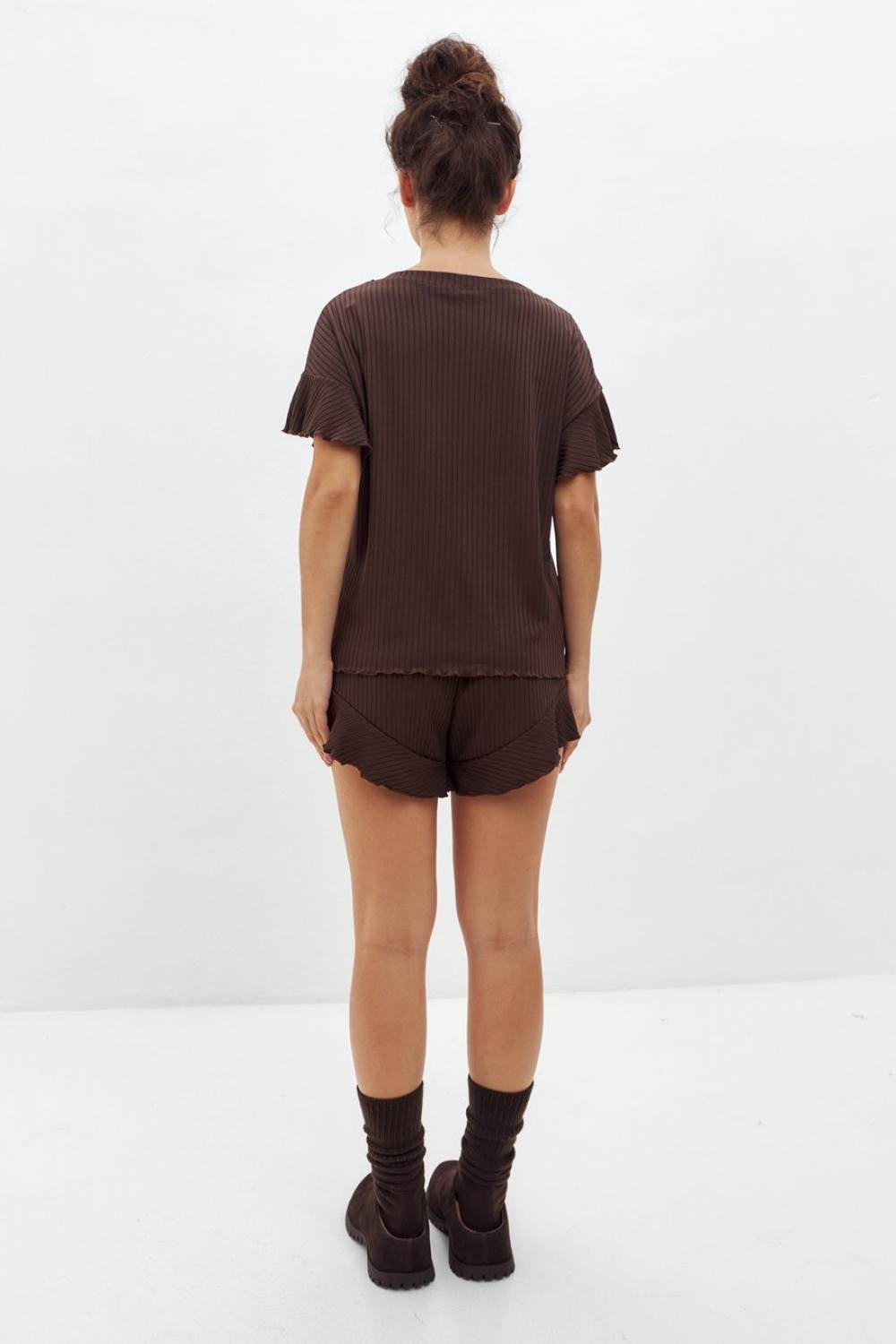 Женская пижама с шортами выполнена из однотонного трикотажного полотна «лапша» (Х/Б 93%, Лайкра 7%). Футболка прямая, свободного кроя, с короткими втачными рукавами-крылышками на спущенном плече. Круглый вырез горловины обработан притачной бейкой. Длина футболки средняя: ниже талии, выше линии бедра. Шорты свободного кроя на цельнокроеном поясе с резинкой в подгибке, длиной выше середины бедра. Фигурный низ шорт декорирован небольшим воланом. Волан и низ рукавов обработан ролевым швом с волнистым краем.