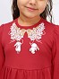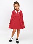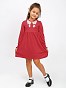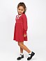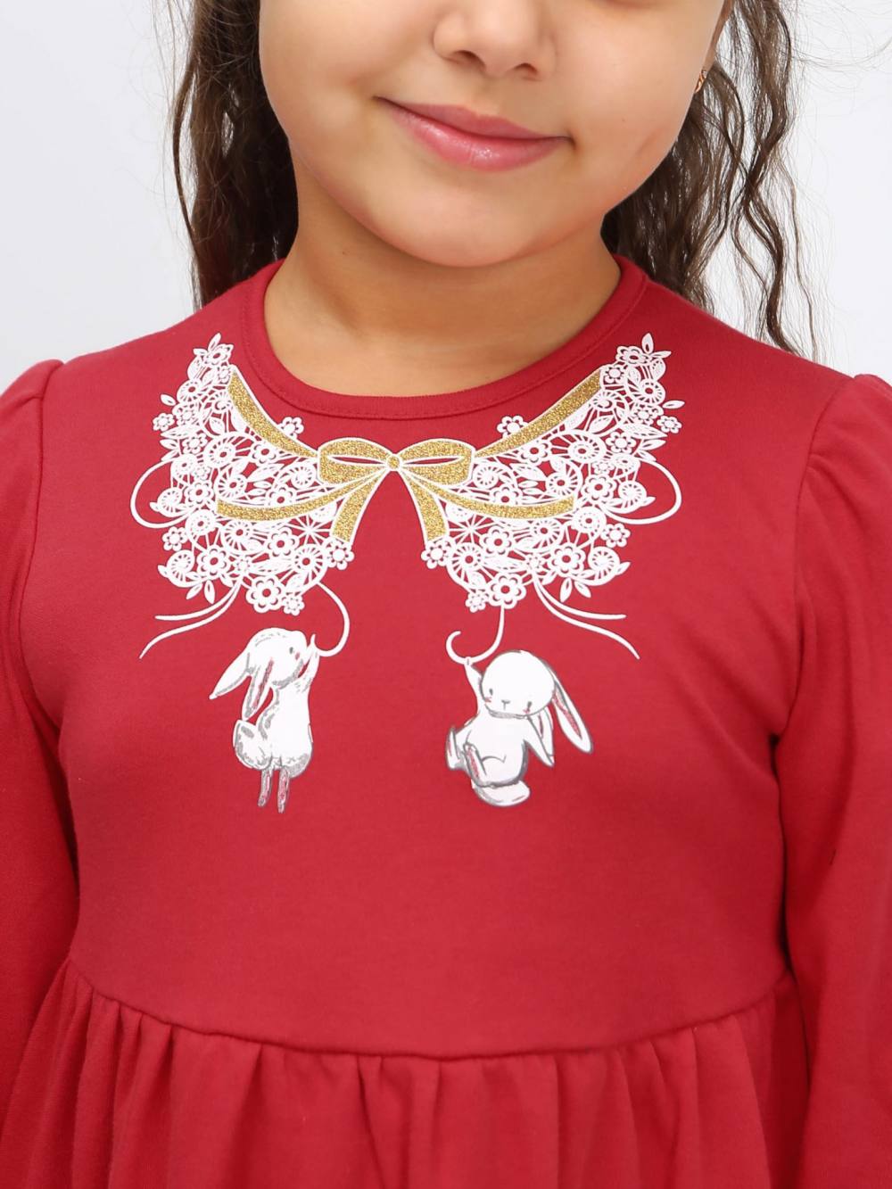 Платье из хлопковой ткани, отрезное выше талии. Юбка - на сборке под грудью. Горловина отделана окантовкой из этой же ткани. Для удобства одевания на спинке предусмотрена планка на кнопках. Полочку украшает шелкография с забавным декоративным сюжетом: кролики плетут кружевной белый воротничок, украшающий вырез платья. Рукав втачной с небольшой сборкой по окату и на цельнокроенном манжете с резинками и оборкой по низу.