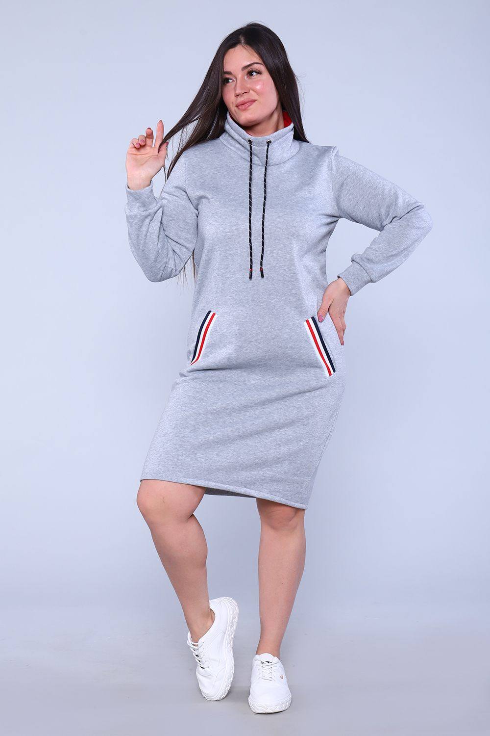 Платье женское в спортивном стиле, прямого силуэта. Длинный рукав ма манжете, воротник стойка на шнуровке через люверсы. На передней полочке прорезные карманы с отделкой. Теплое и удобное.