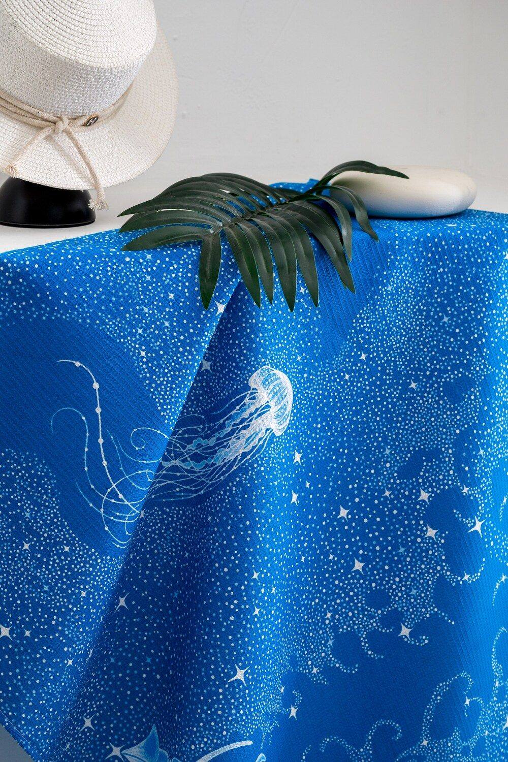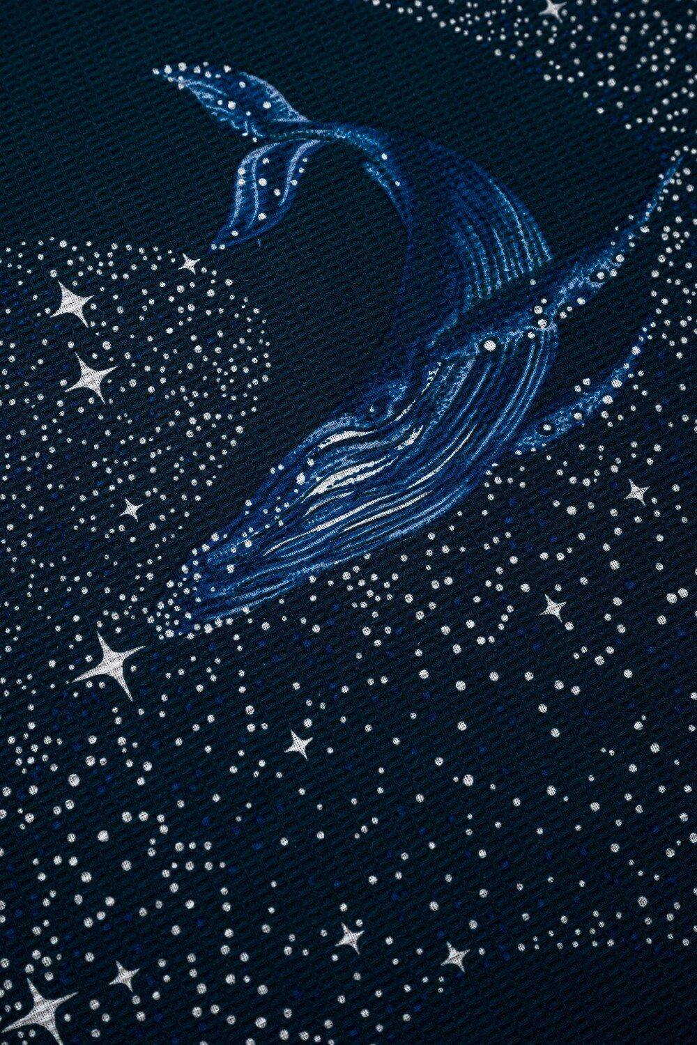 Полотенце представлено в двух цветах - синем и темно-синем, с узорами китов, медуз, черепах и звезд. Эти морские мотивы придают полотенцу особый шарм и делают его отличным подарком для любителей моря и пляжа.
