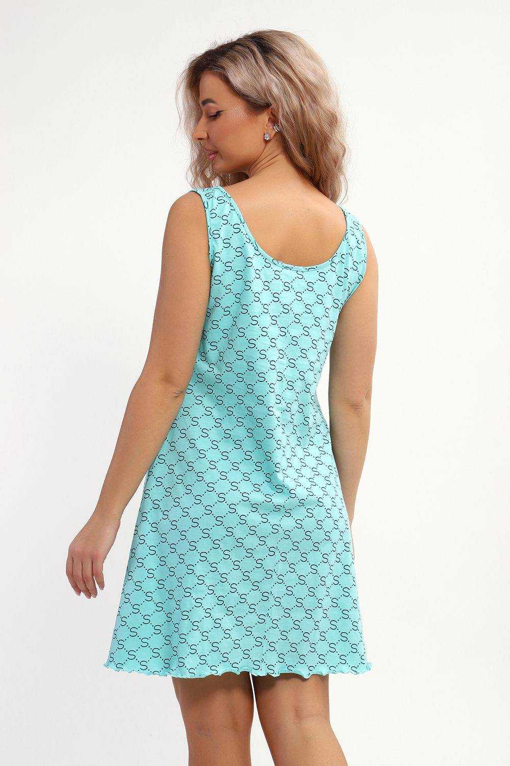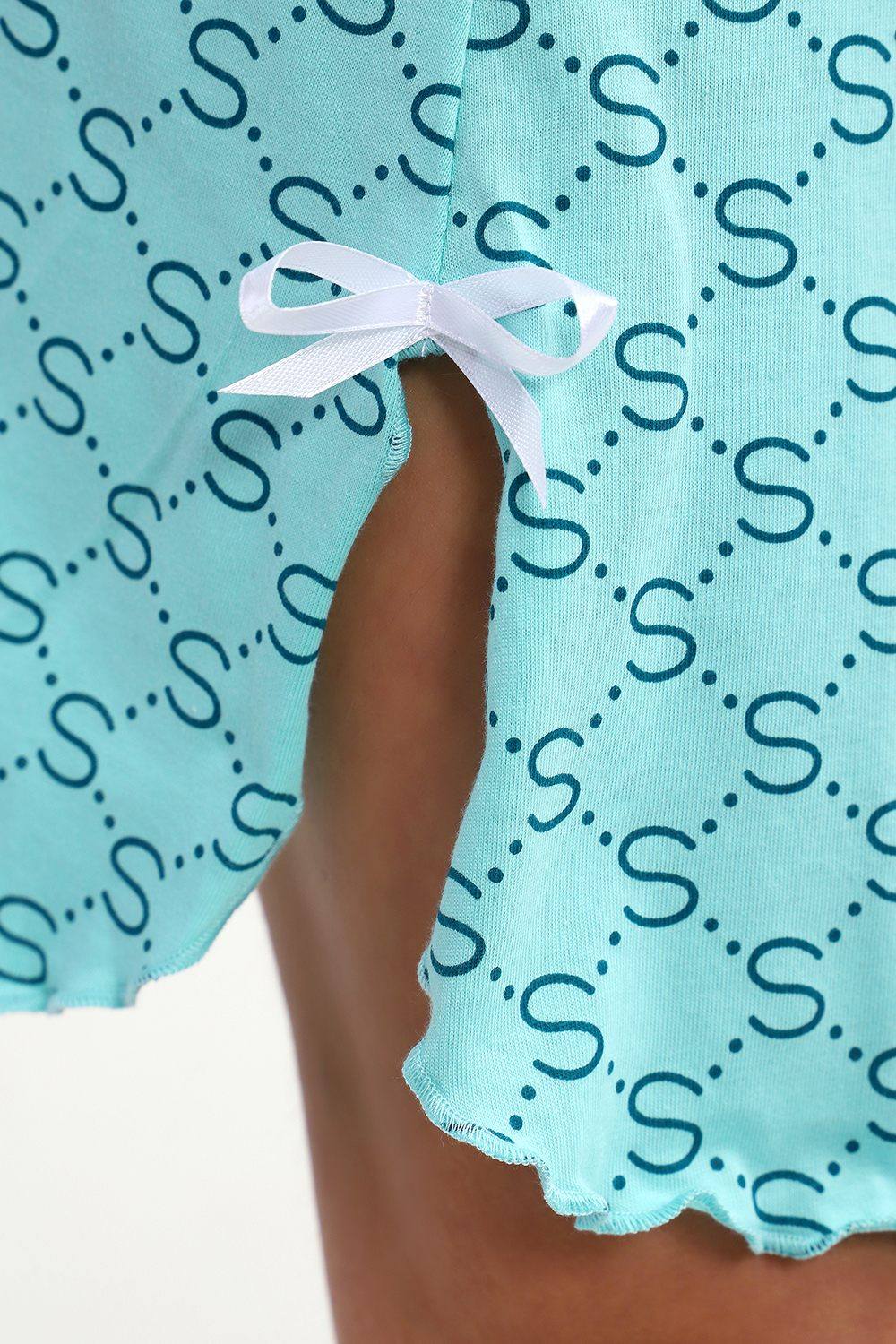 Сорочка с V образным вырезом. Полочка отрезная под грудью. Юбка с рельефами. Нашиты бантики. Подходит для беременных.