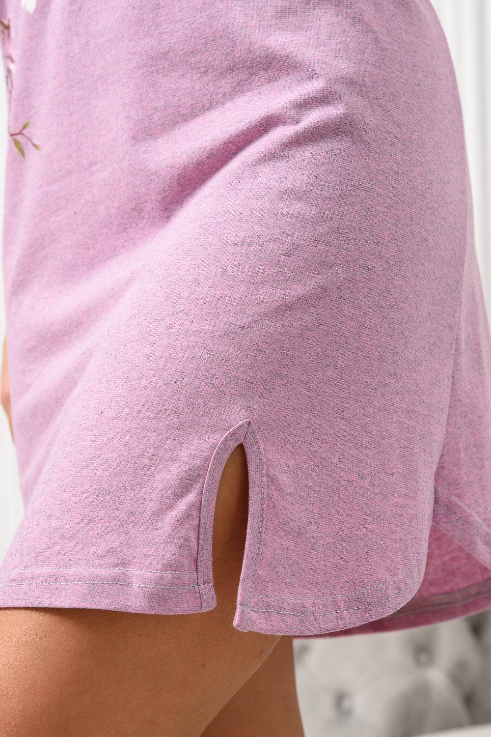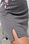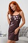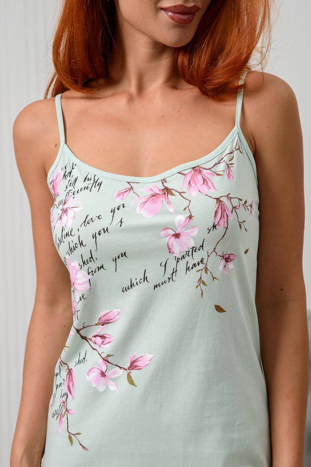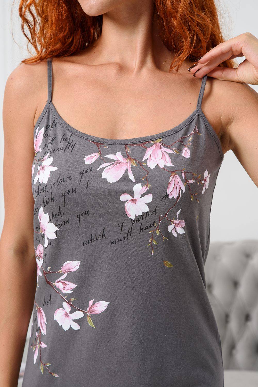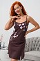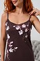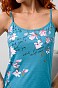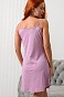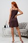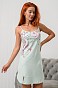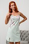 Сорочка на бретелях полуприлегающего силуэта, с фигурной линией низа, длиной выше колена. На полочке внизу обработан декоративный разрез. Проймы, бретели и разрез на полочке обработаны бейкой из основного полотна.