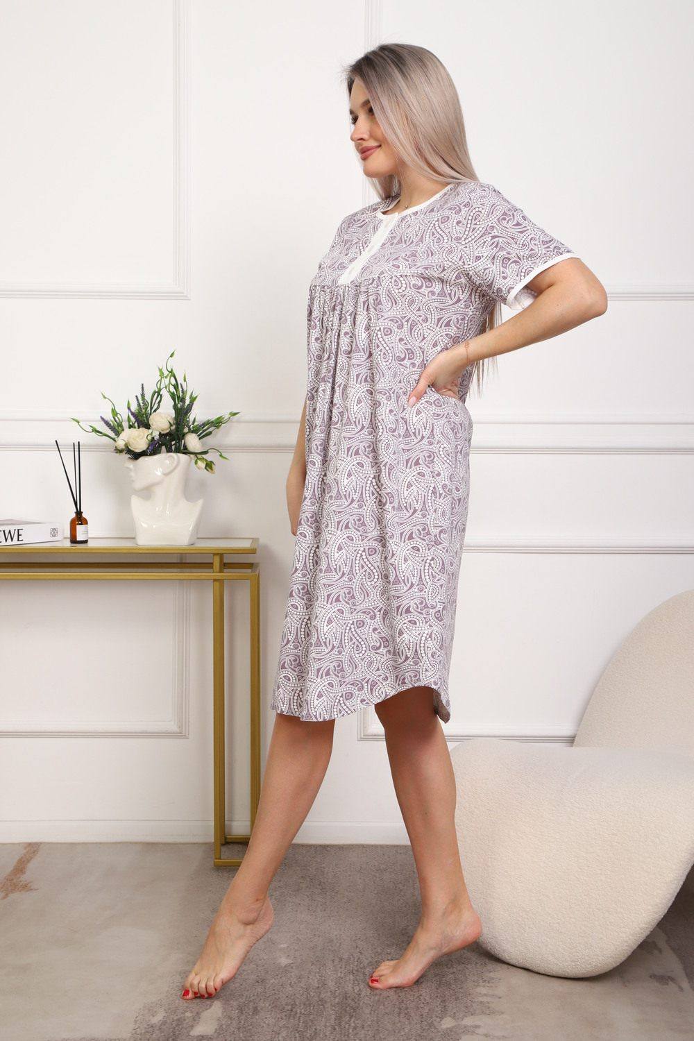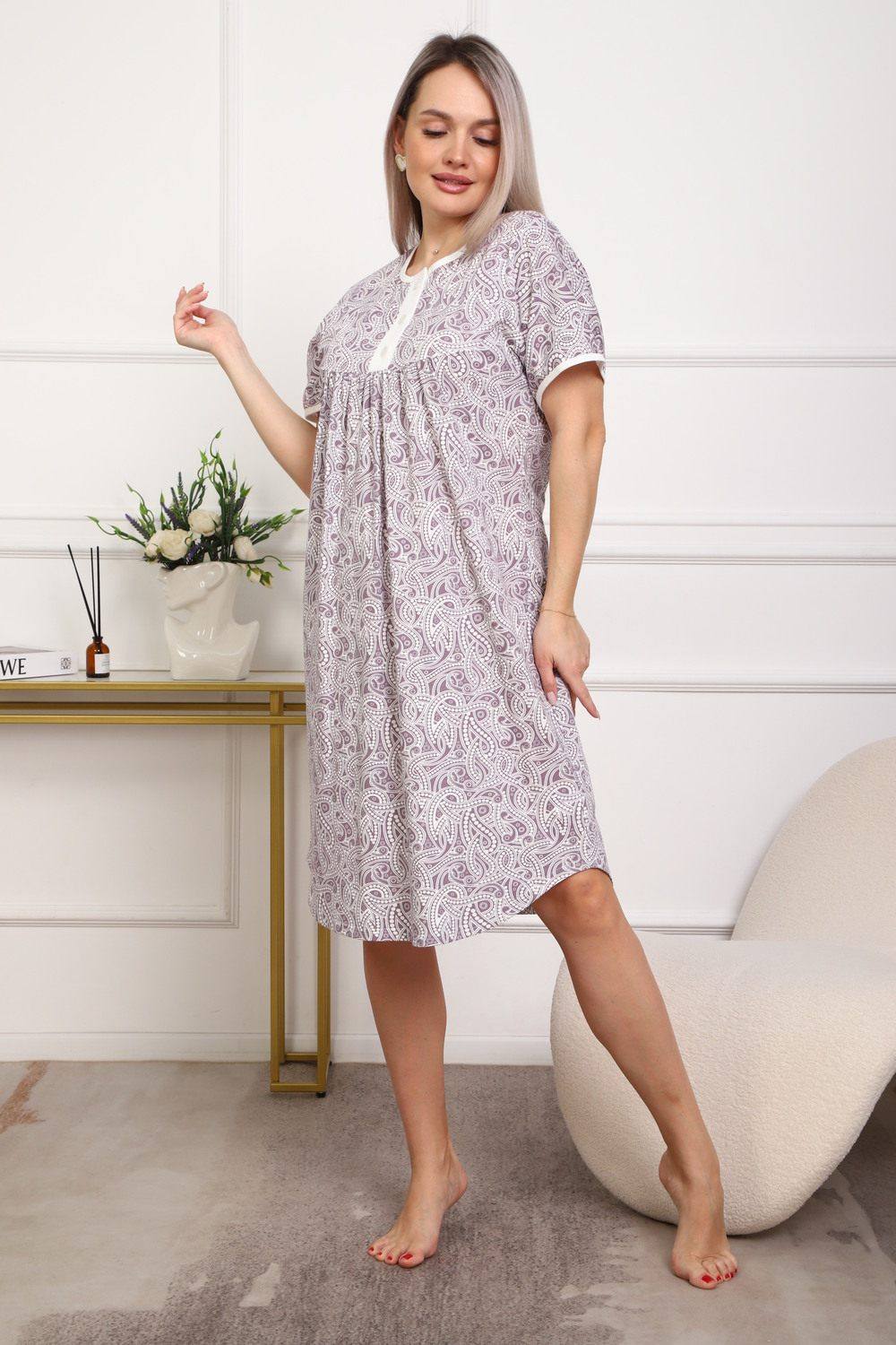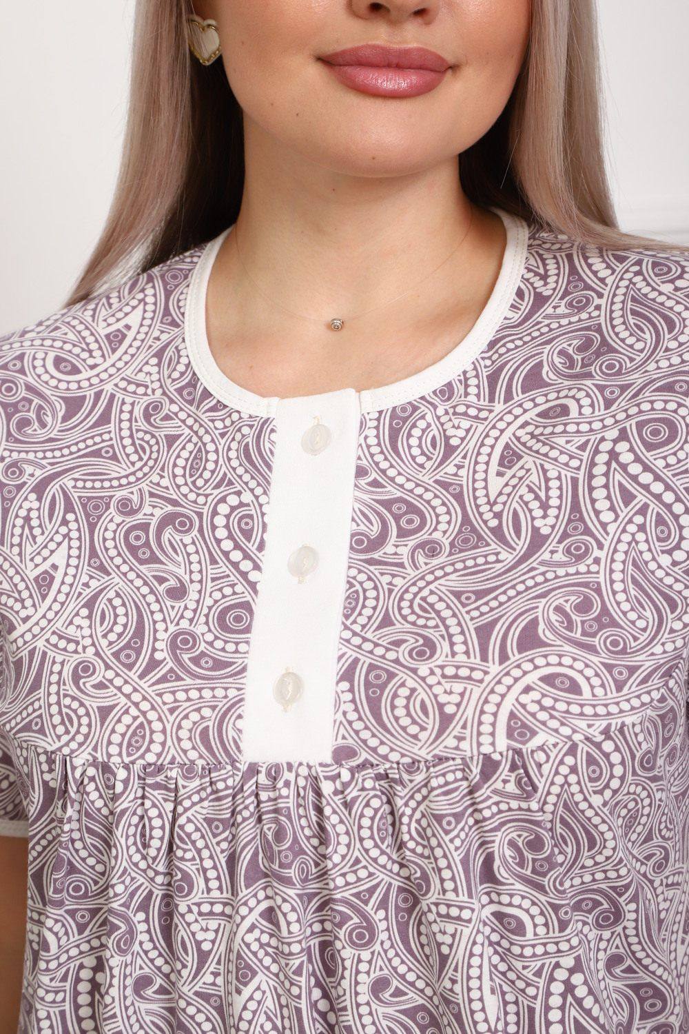 Приятная к телу сорочка из кулирного хлопкового полотна . Удобный короткий рукав, кокетка с планкой на пуговицах. Фасон достаточно свободный за счет хорошей сборки на полочке. Низ изделия фигурный, подшит на плоскошовной машине. Горловина и рукава обработаны окантовкой. из кулирки,