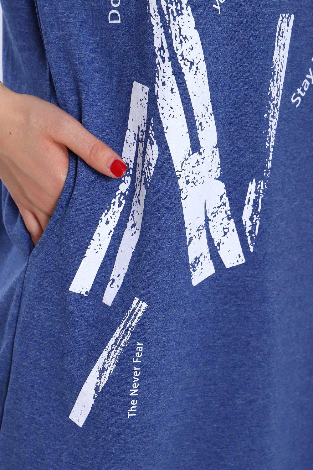 Туника свободного кроя из хлопковой кулирки. На полочке крупный монохромный принт. Рукав короткий на базе спущенного плеча, длина - ниже колена.