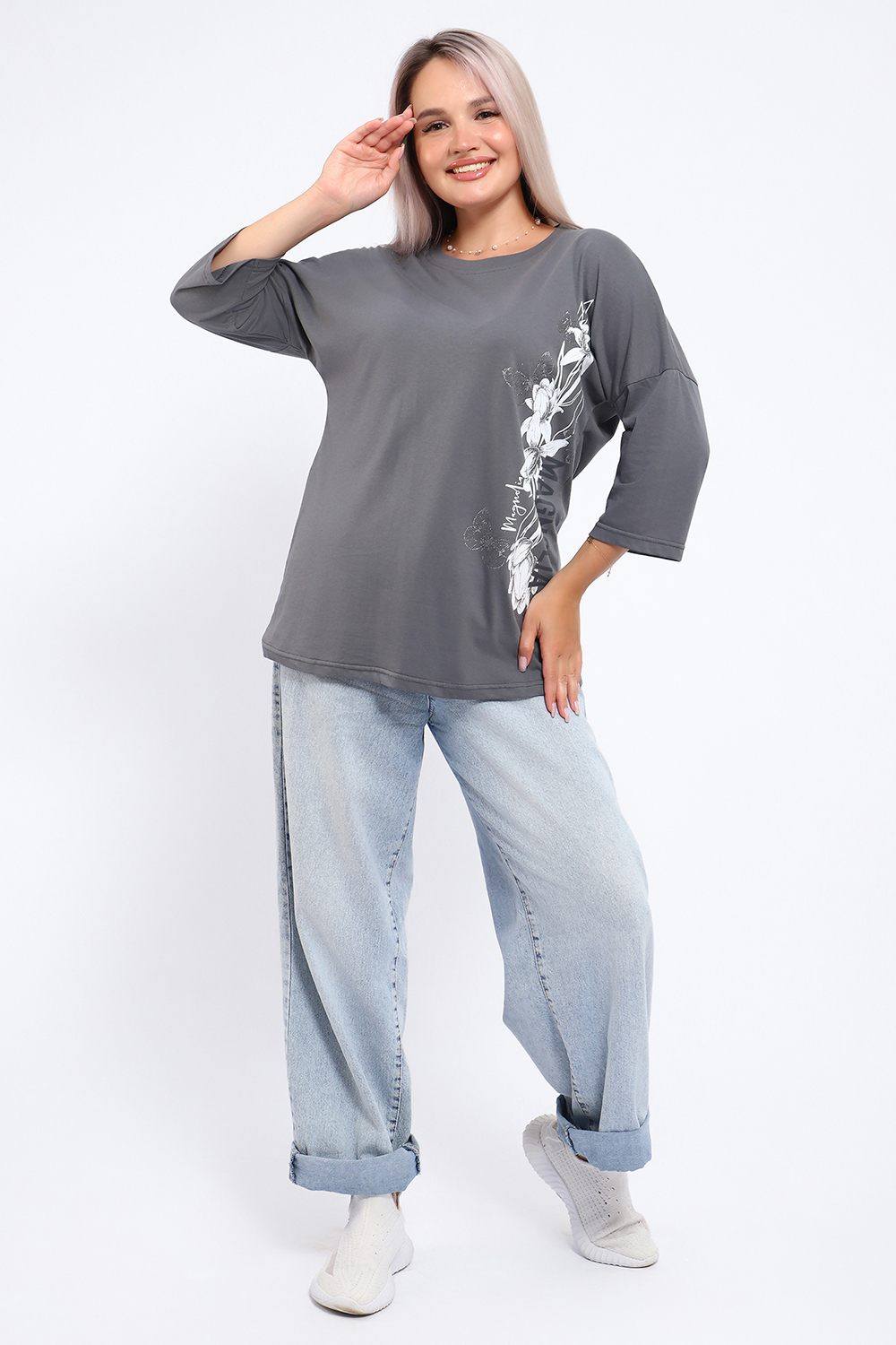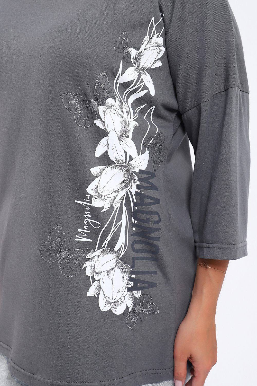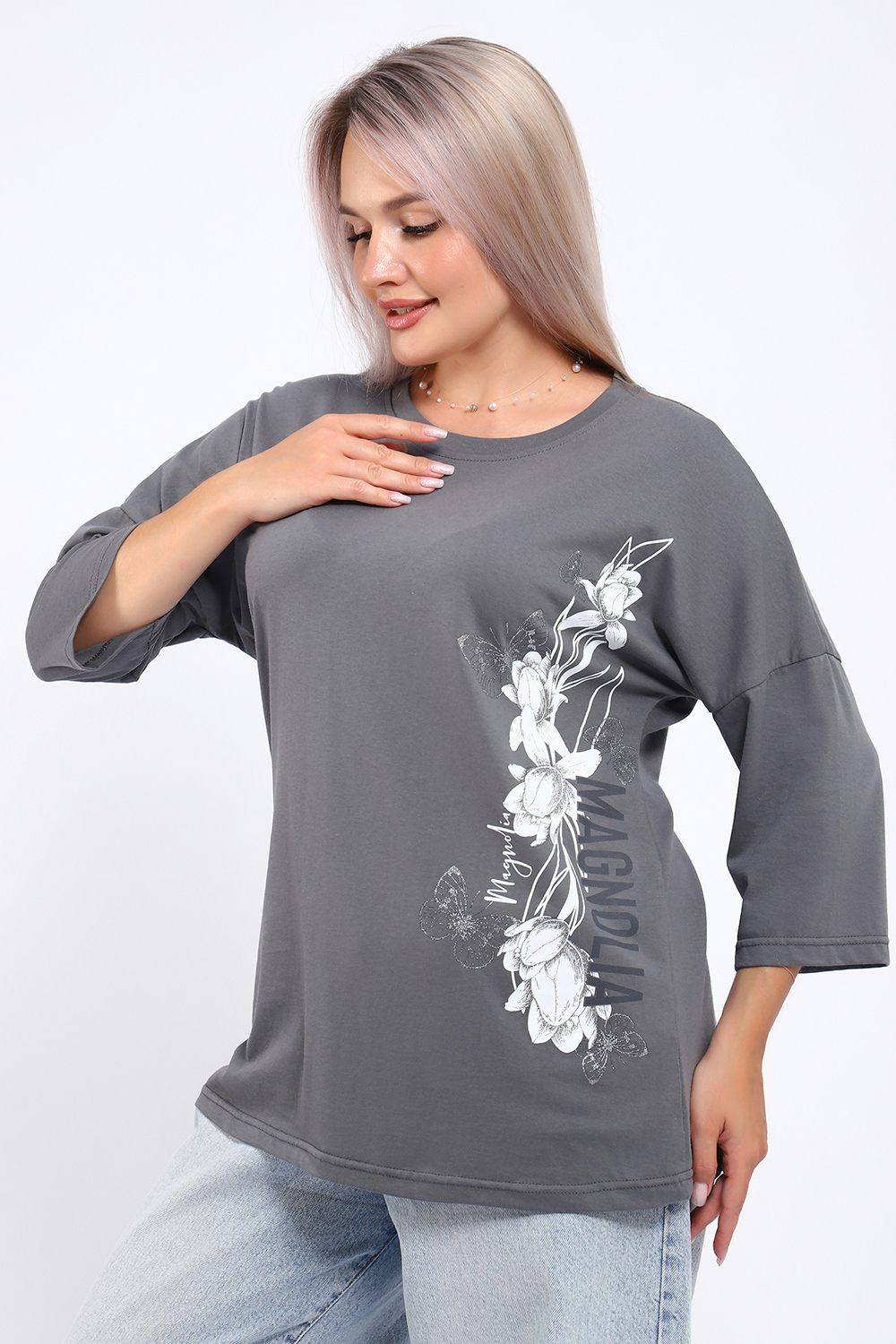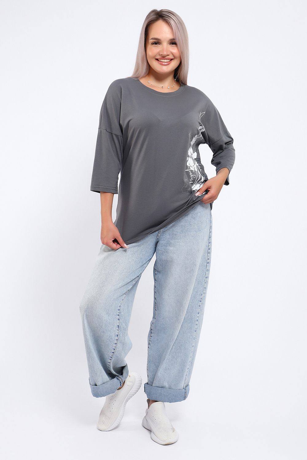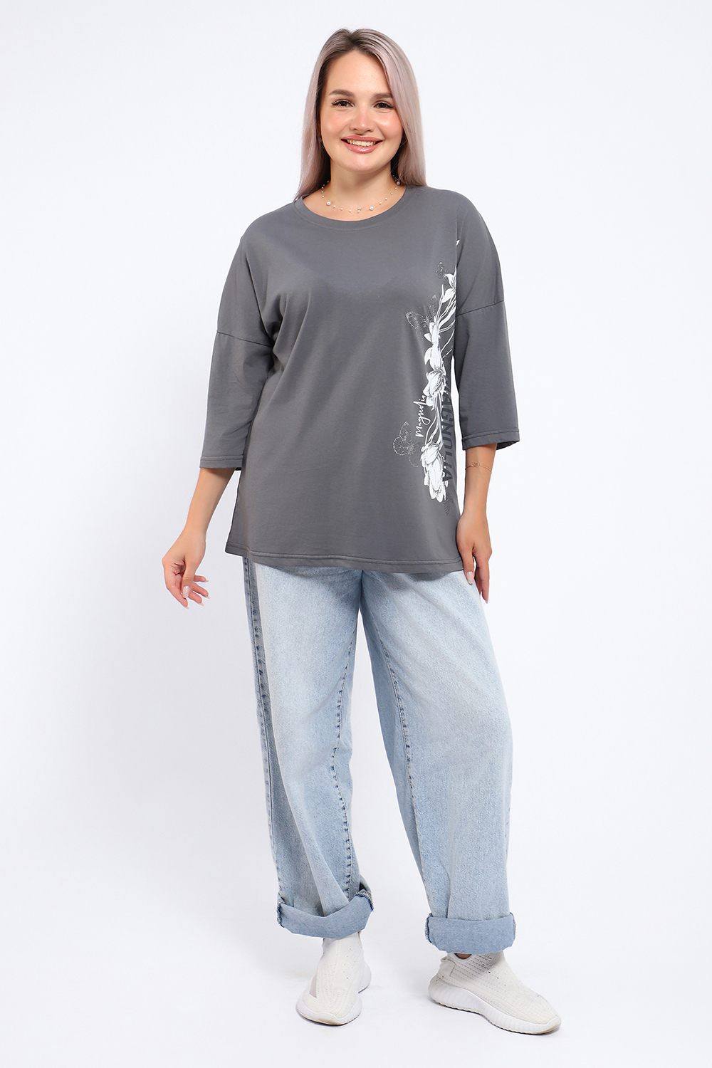Туника свободного кроя из мягкого, натурального хлопка подарит ощущение комфорта и уюта. Принт маки с использованием глиттера и техники объёмной печати украшает модель, придавая ей изысканный вид. Обработка деталей вкруговую с закрепкой, рукав длиной 3/4, горловина втачная из основной ткани. Большие размеры!