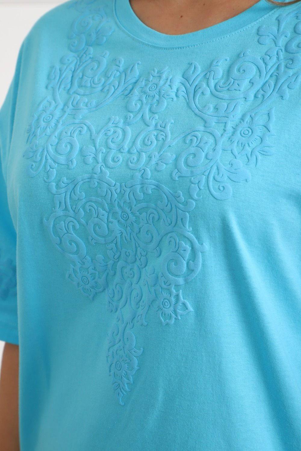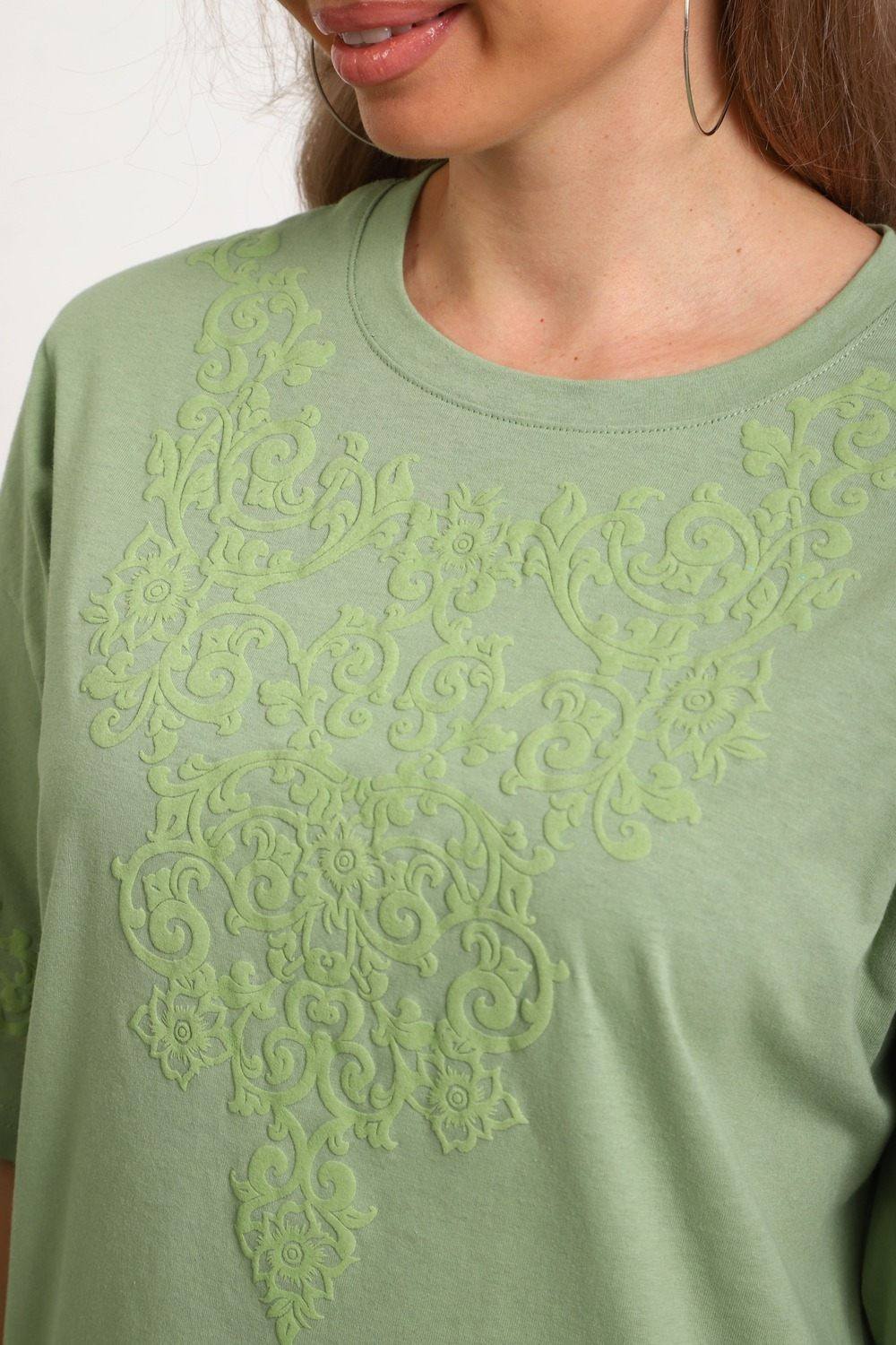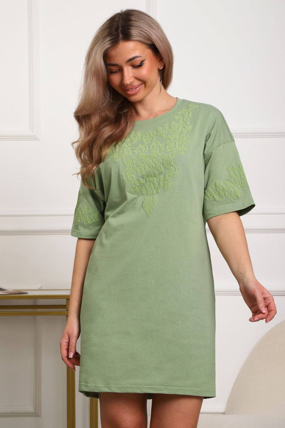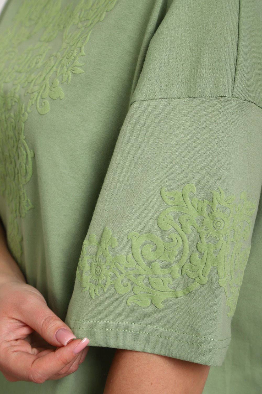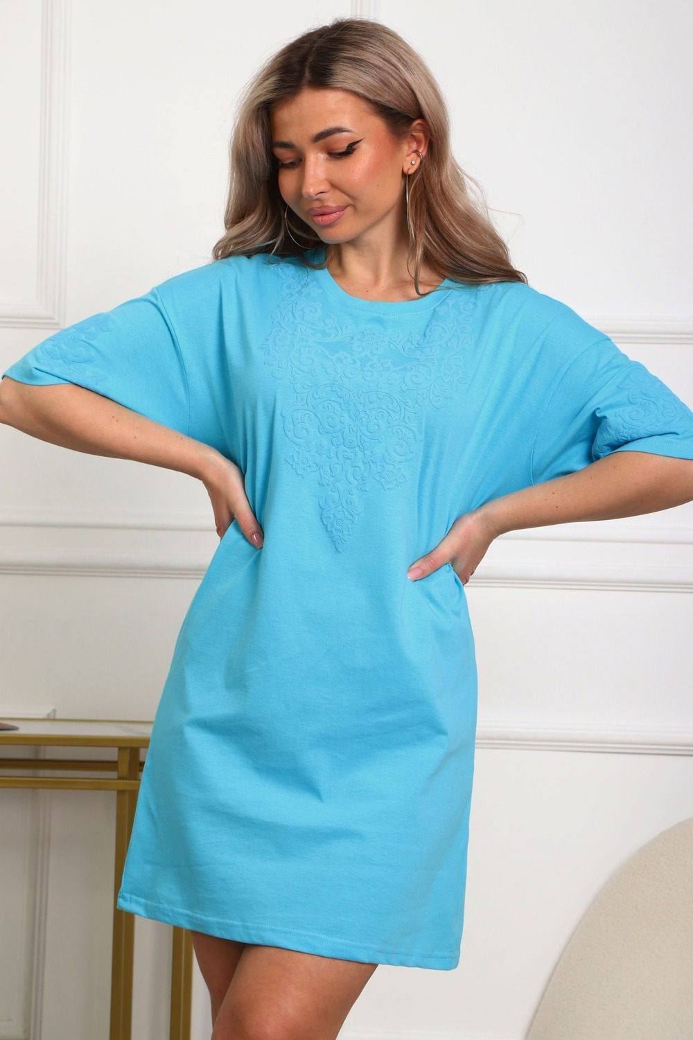 Туника женская прямого силуэта. Низ изделия прямой. Длинна выше колена, плечо спущенное, рукав короткий. Горловина круглой формы. Принт орнамент (шелкография пуф) располагается по центру переда и на рукавах.